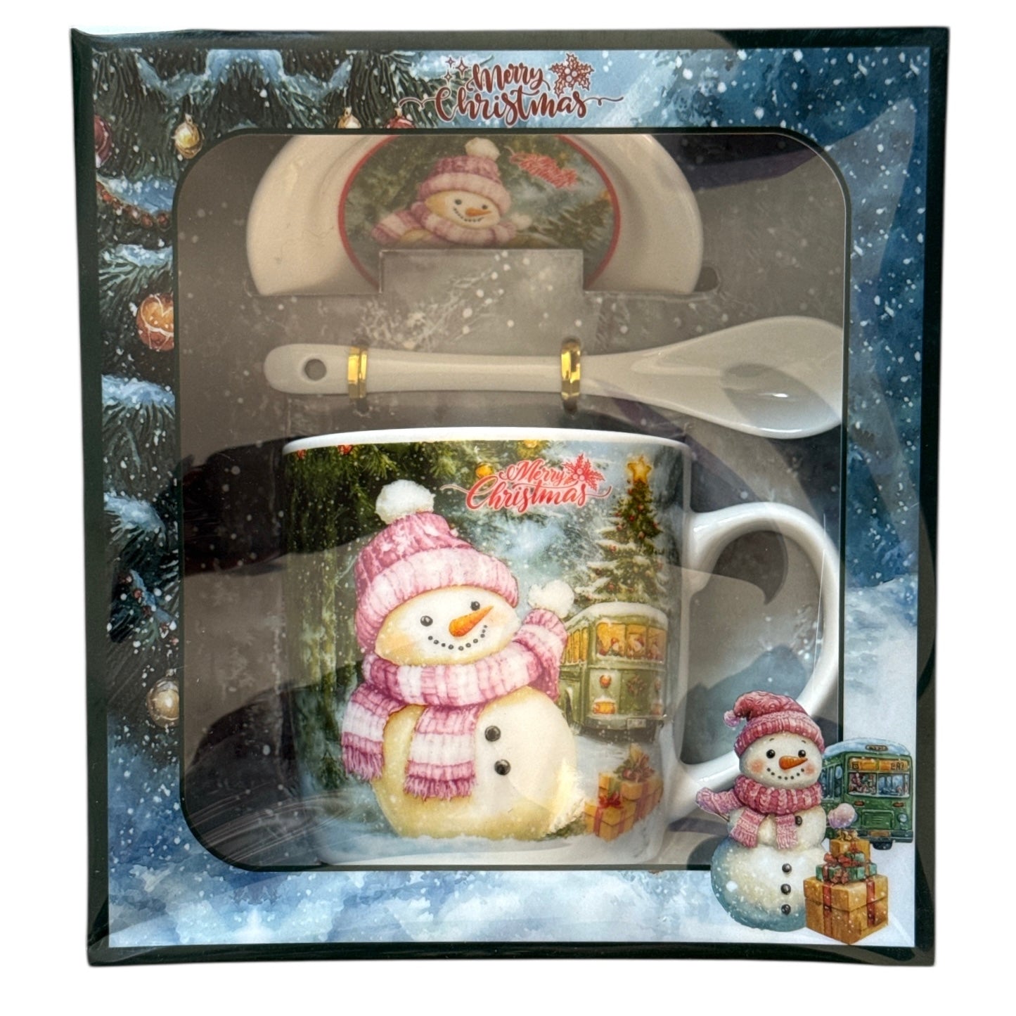 Setul este format dintr-o cană cu o farfurie cu linguriță și vine ambalat într-o cutie elegantă cu motive de Crăciun.