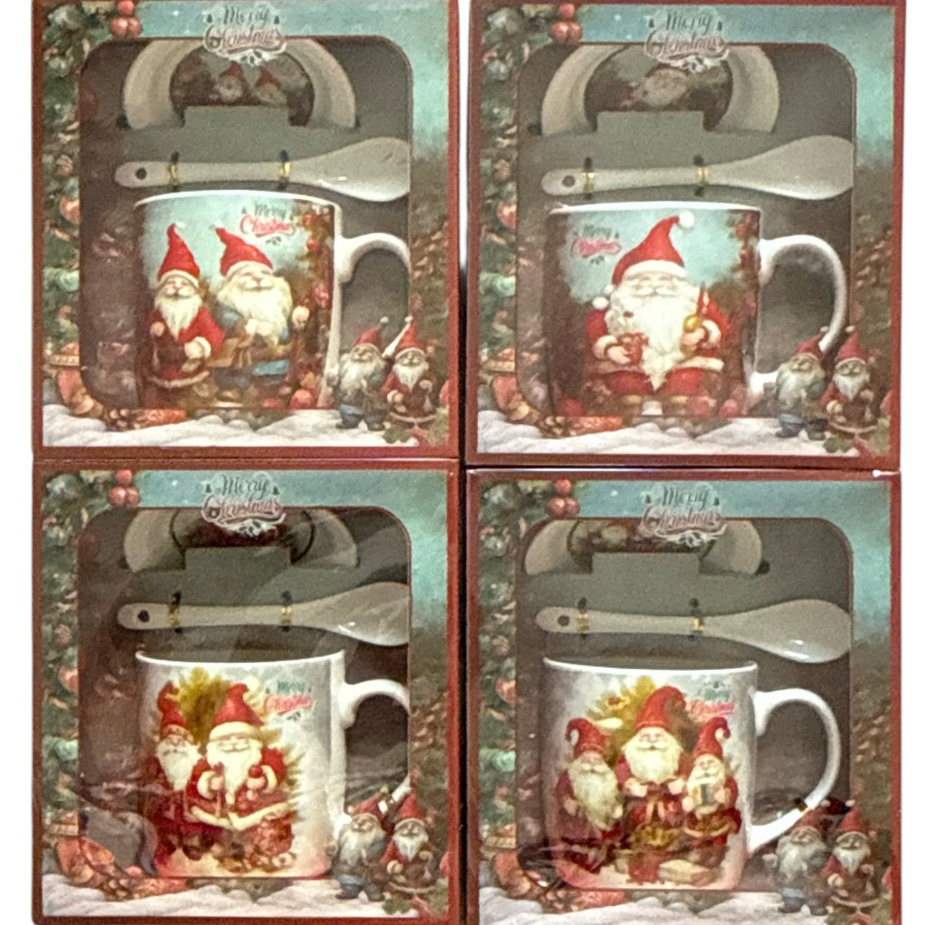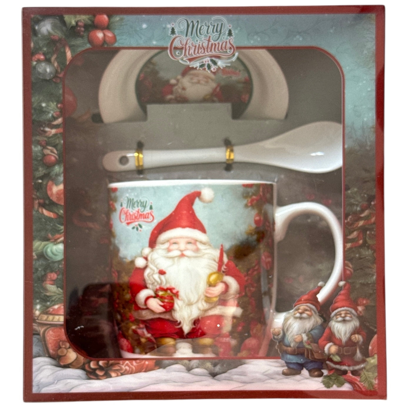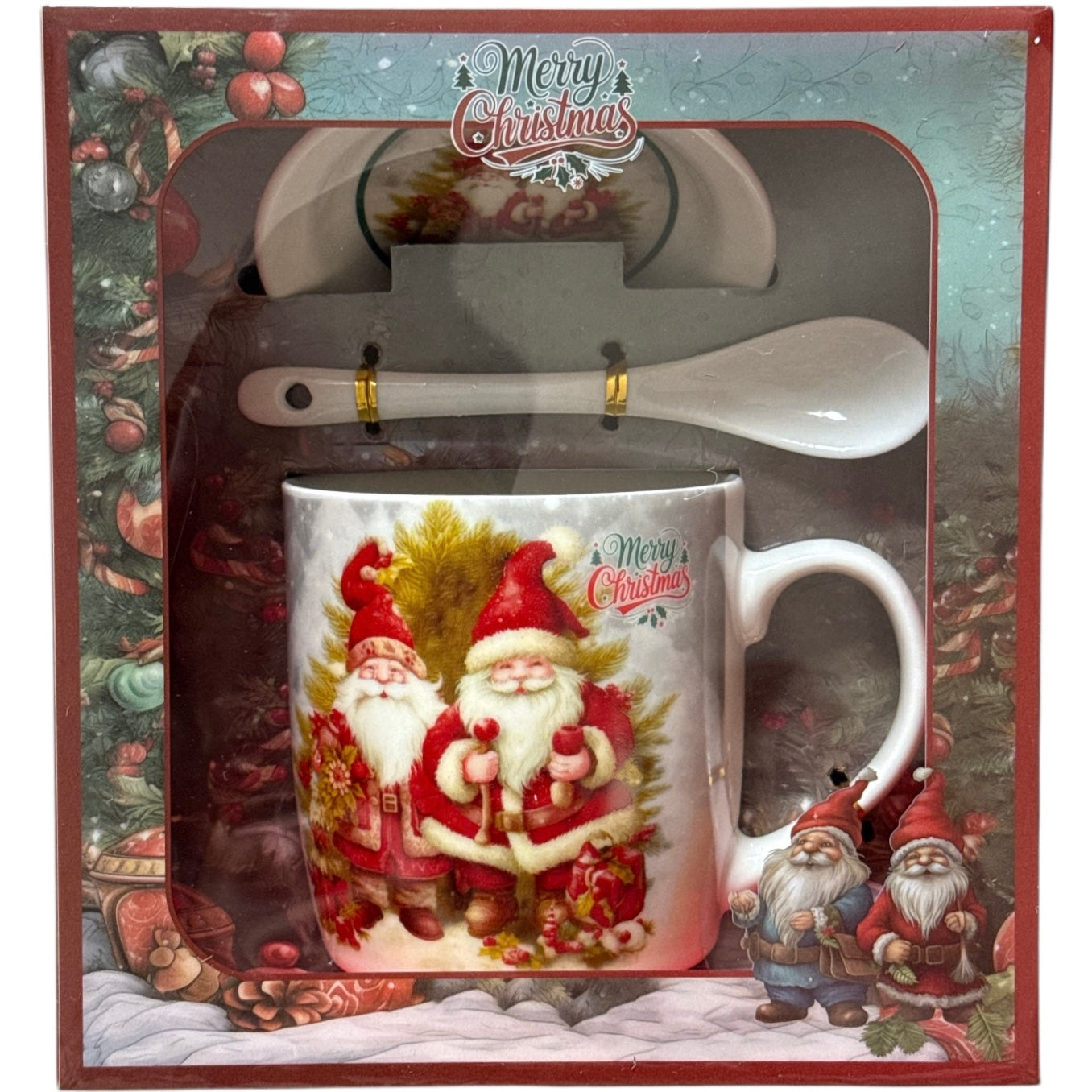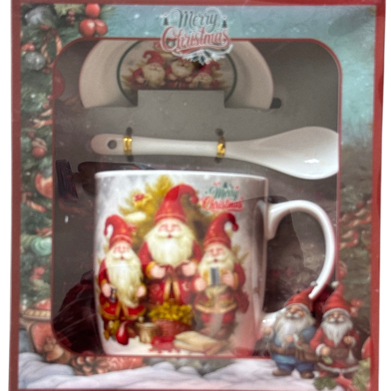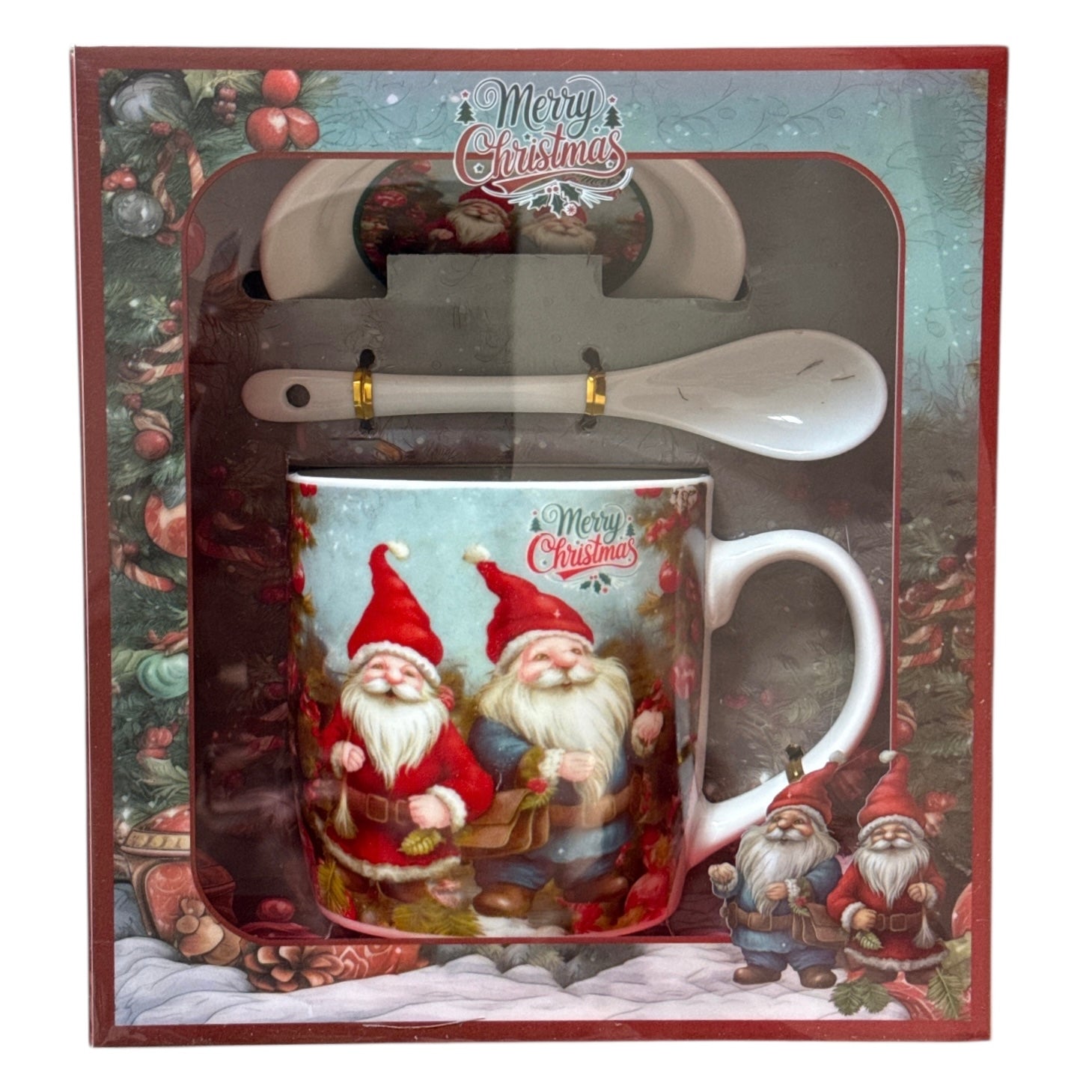 Setul este format dintr-o cană cu o farfurie cu linguriță și vine ambalat într-o cutie elegantă cu motive de Crăciun.