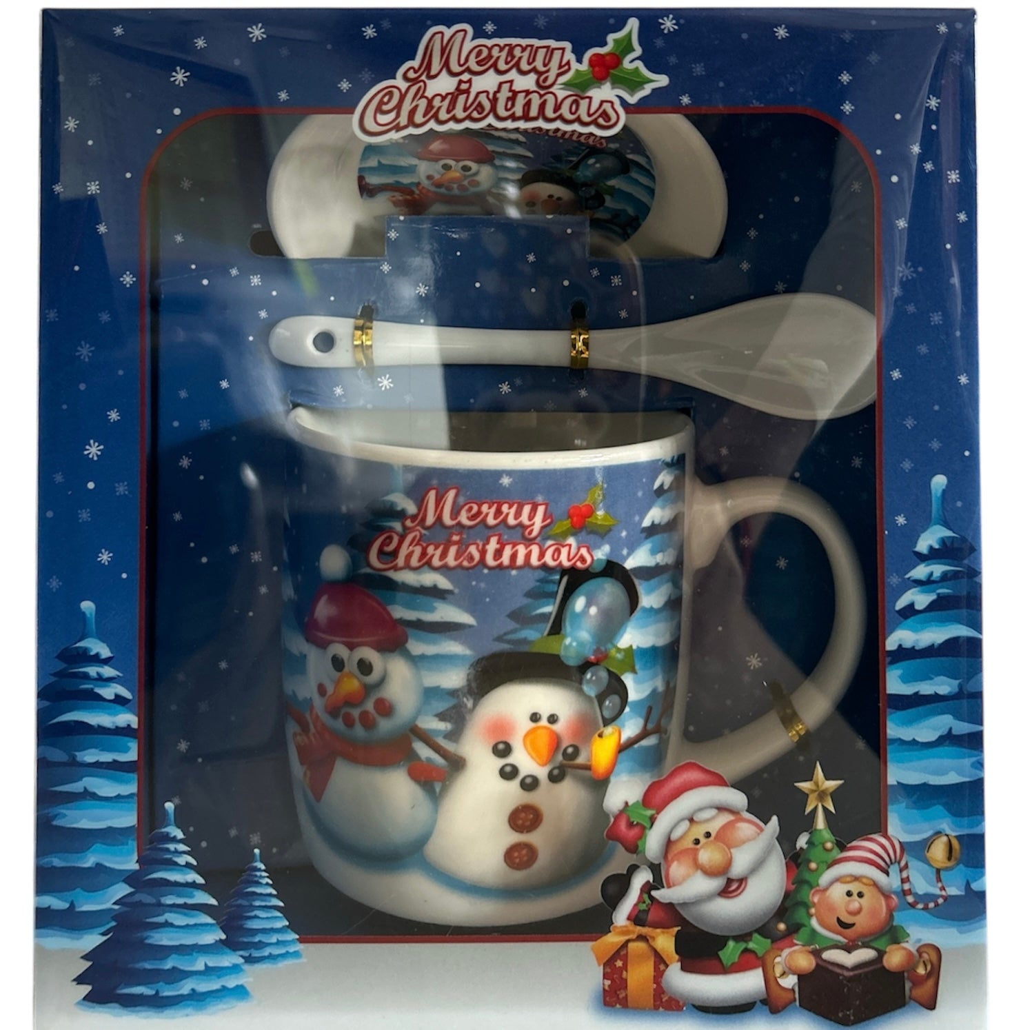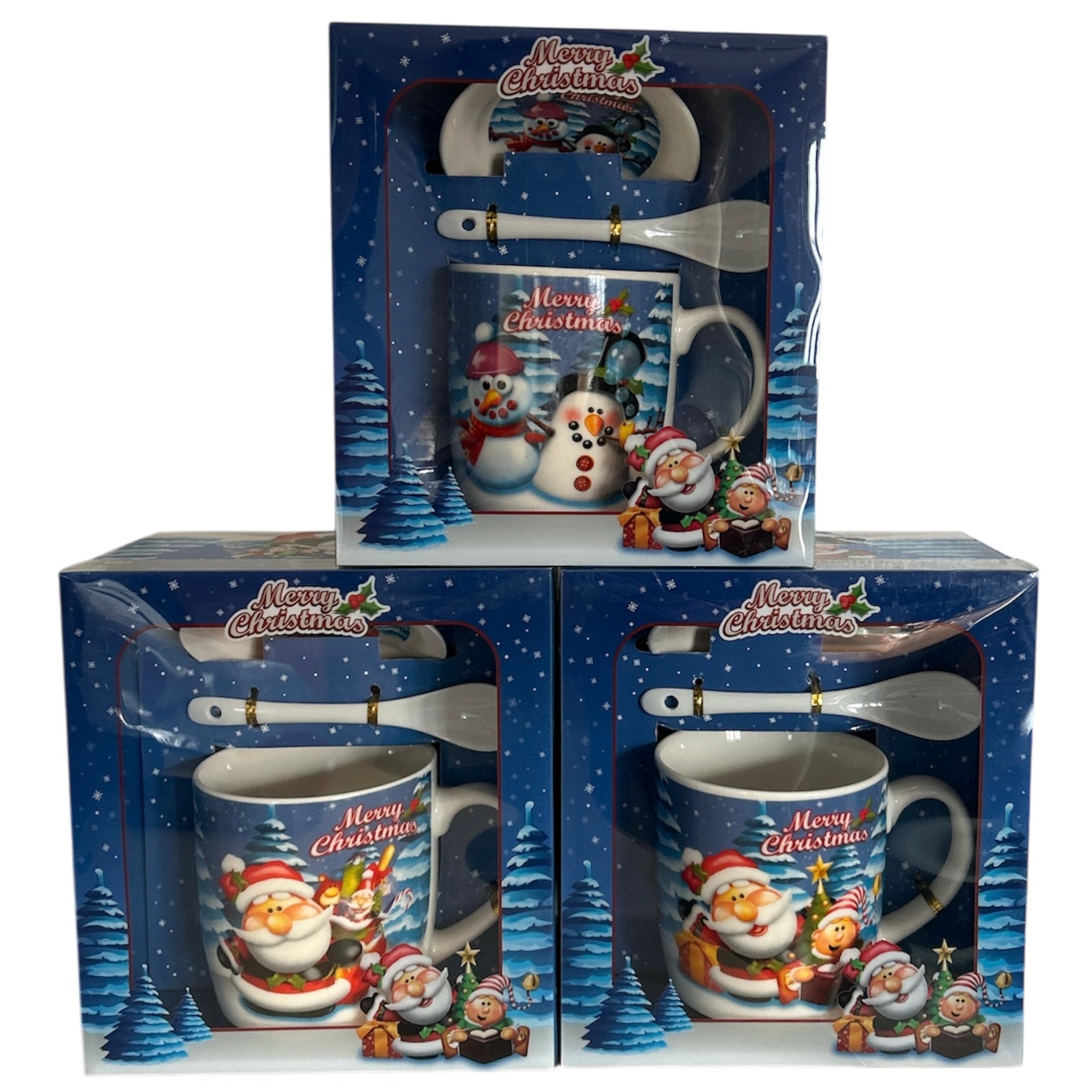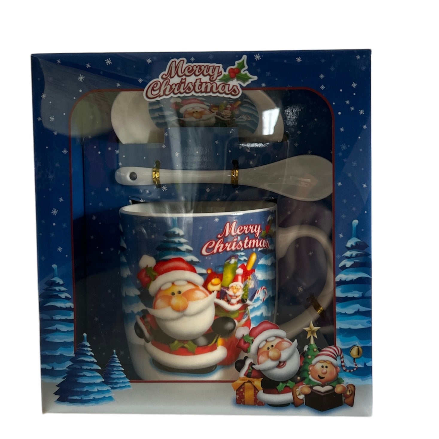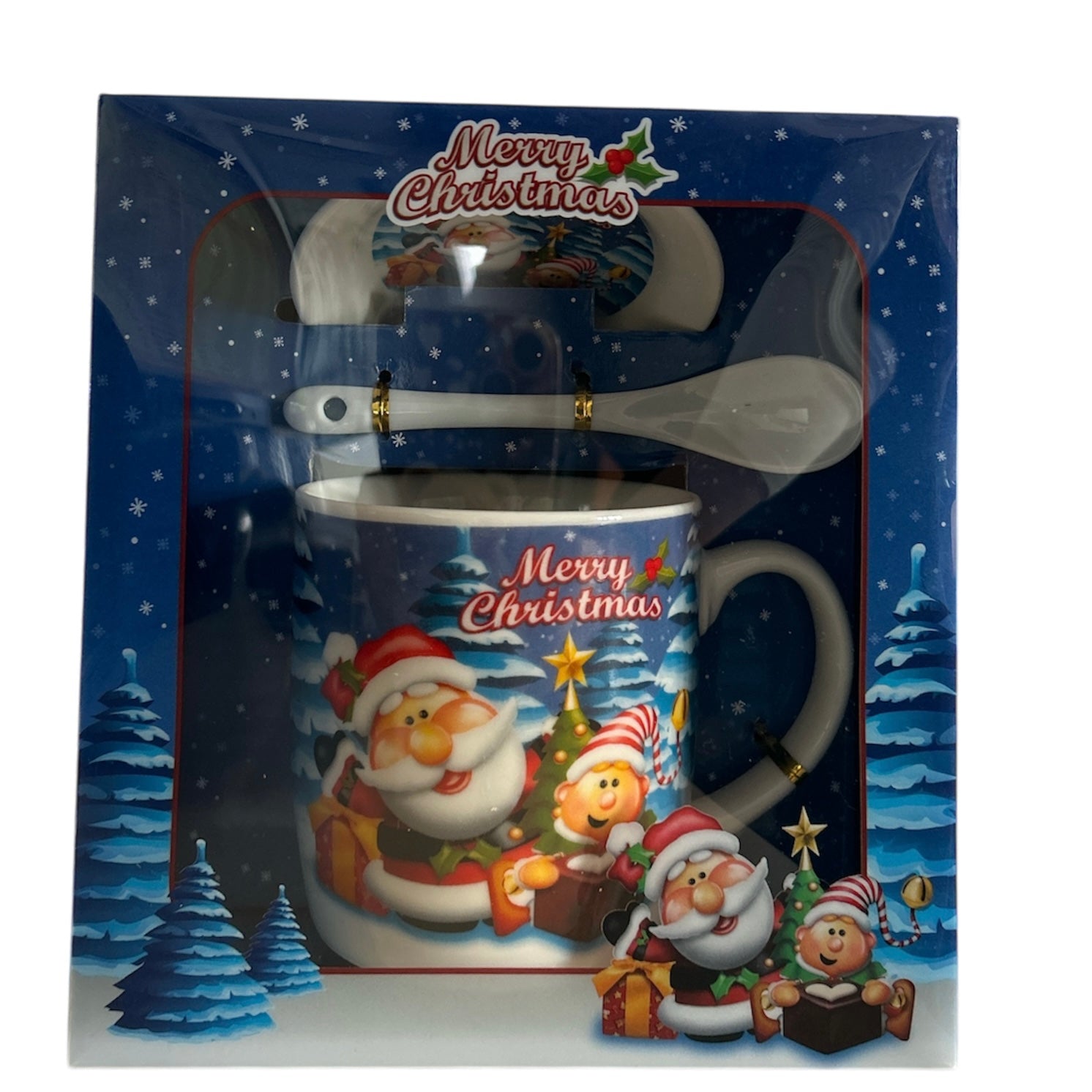 Setul este format dintr-o cană cu o farfurie cu linguriță și vine ambalat într-o cutie elegantă cu motive de Crăciun.