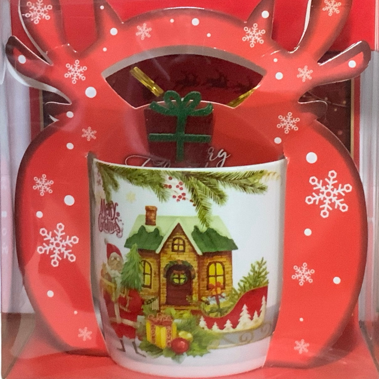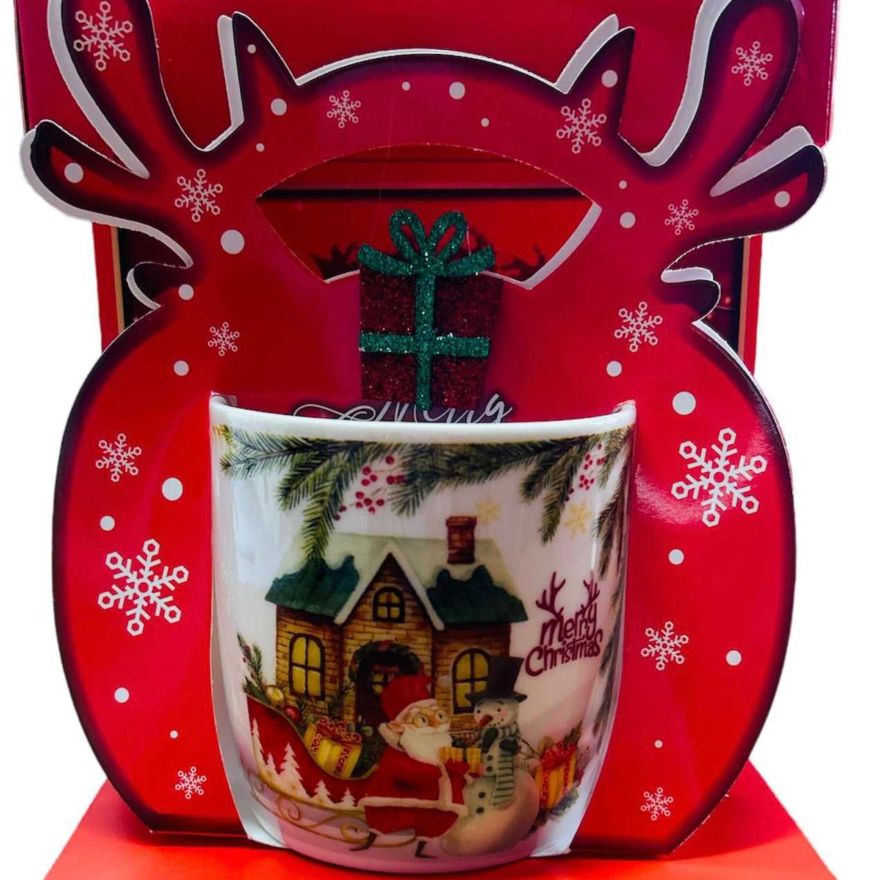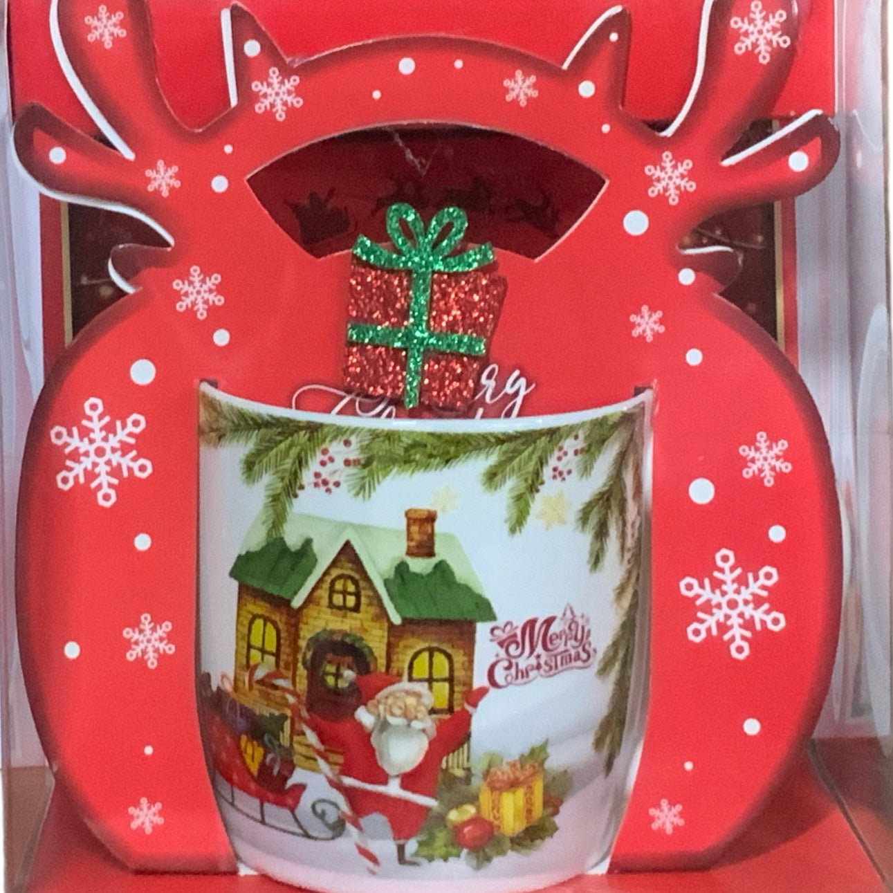 Cadoul este format dintr-o cană cu motive de Crăciun și vine ambalat într-o cutie elegantă în formă de ren