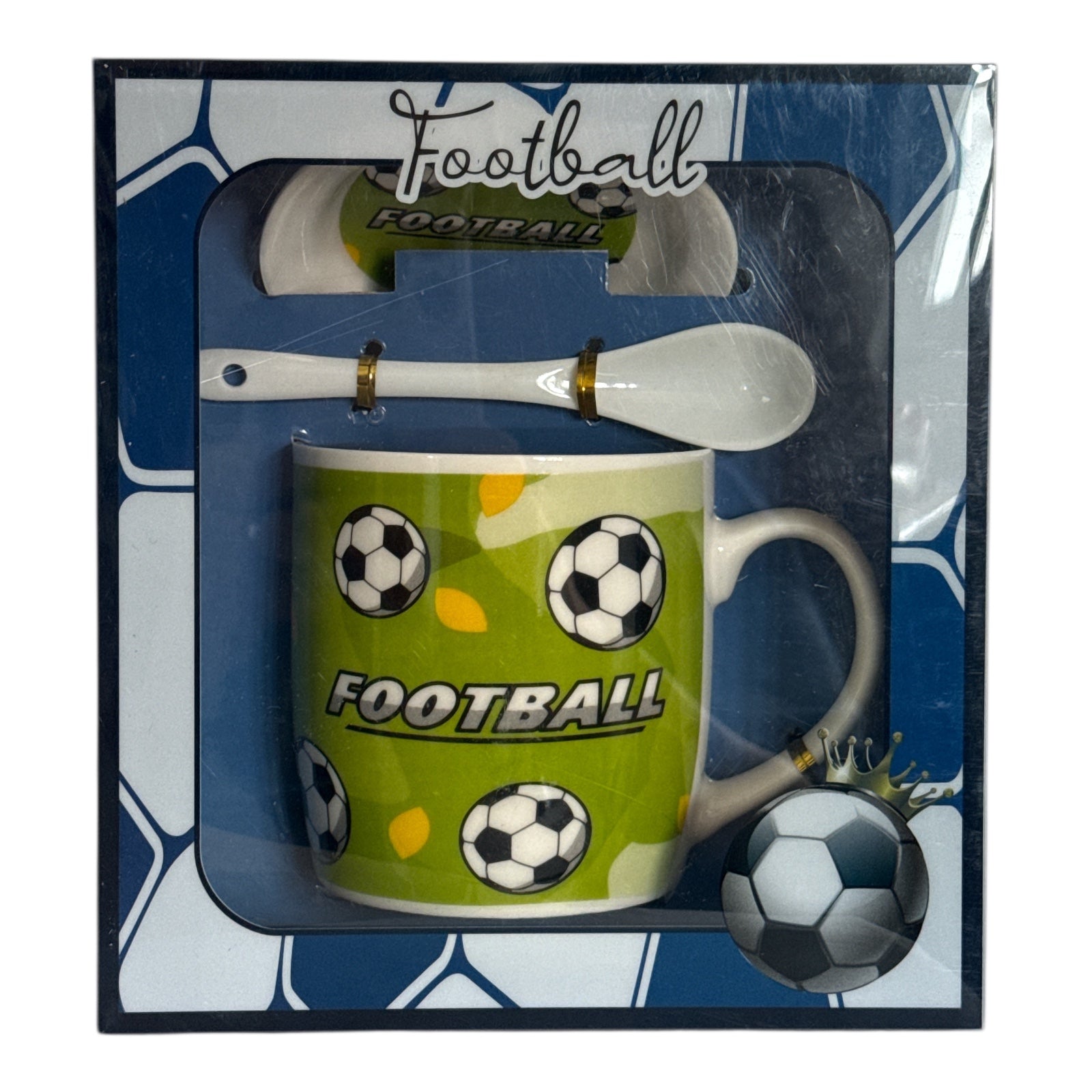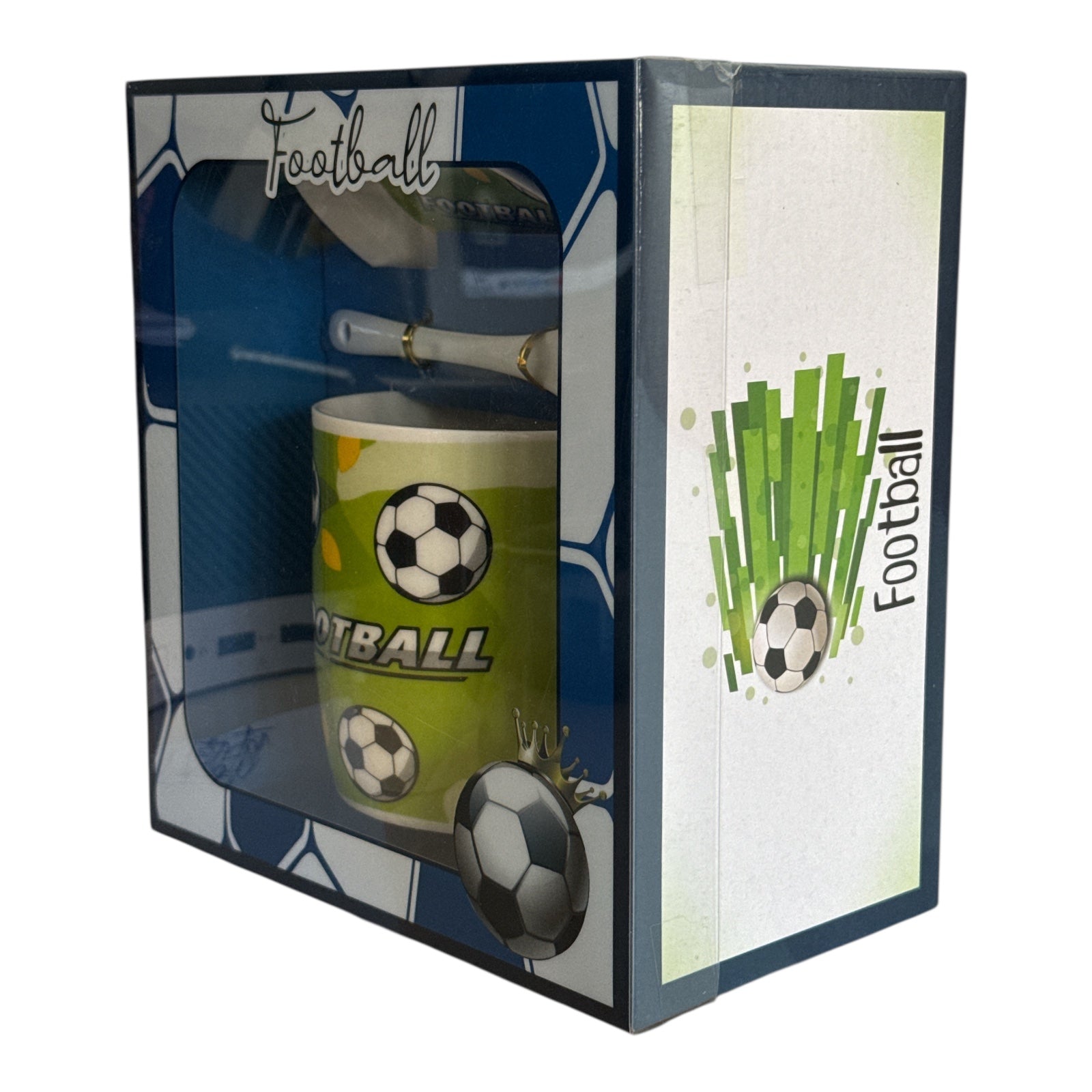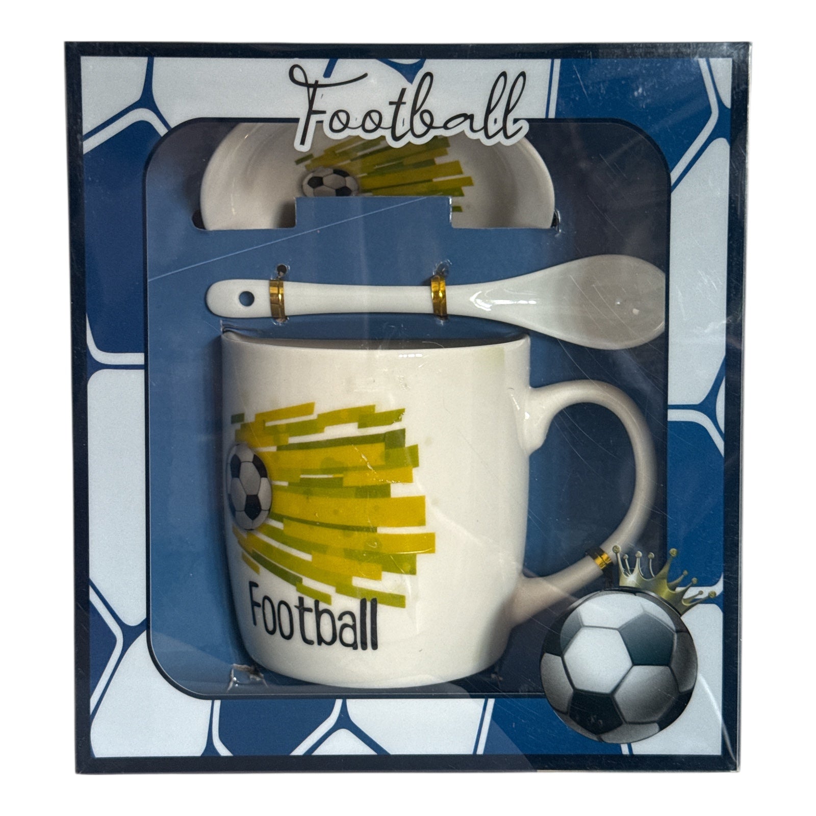 Setul este format dintr-o cană cu o farfurie cu linguriță și vine ambalat într-o cutie elegantă cu motive de Football