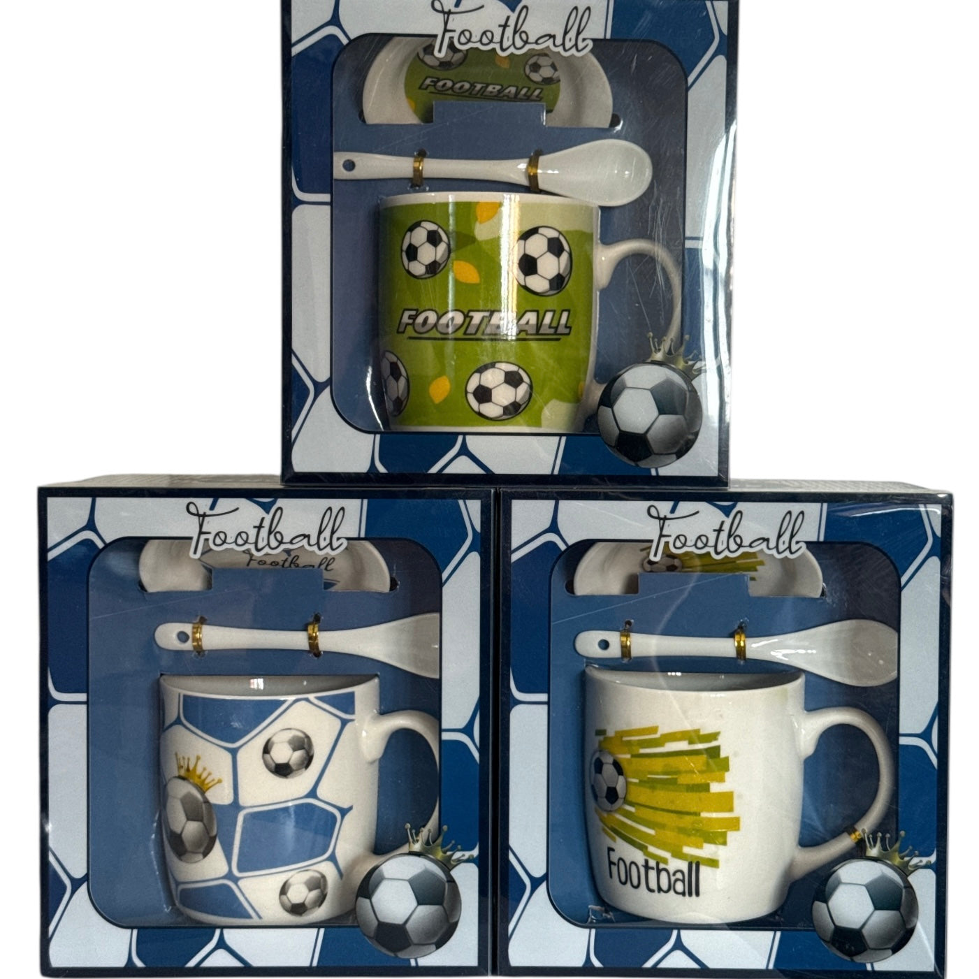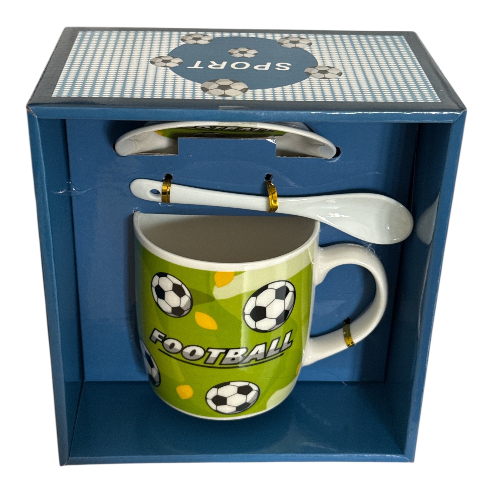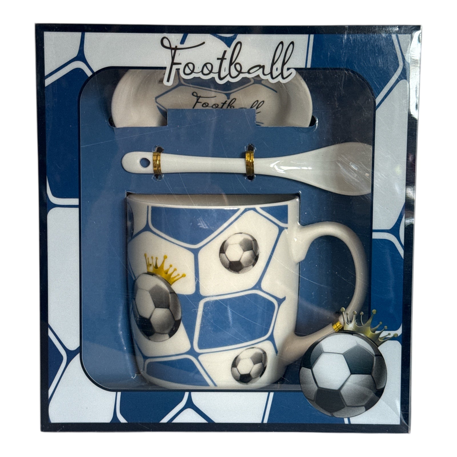 Setul este format dintr-o cană cu o farfurie cu linguriță și vine ambalat într-o cutie elegantă cu motive de Football