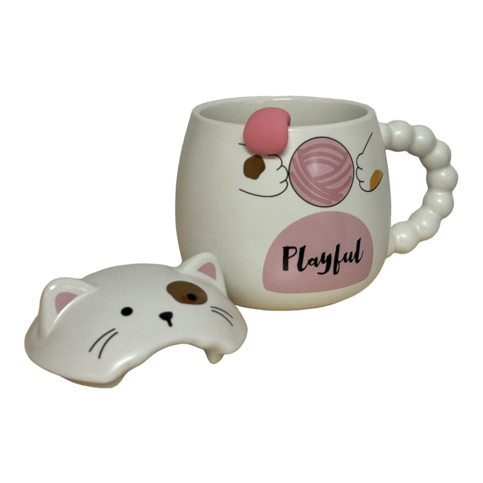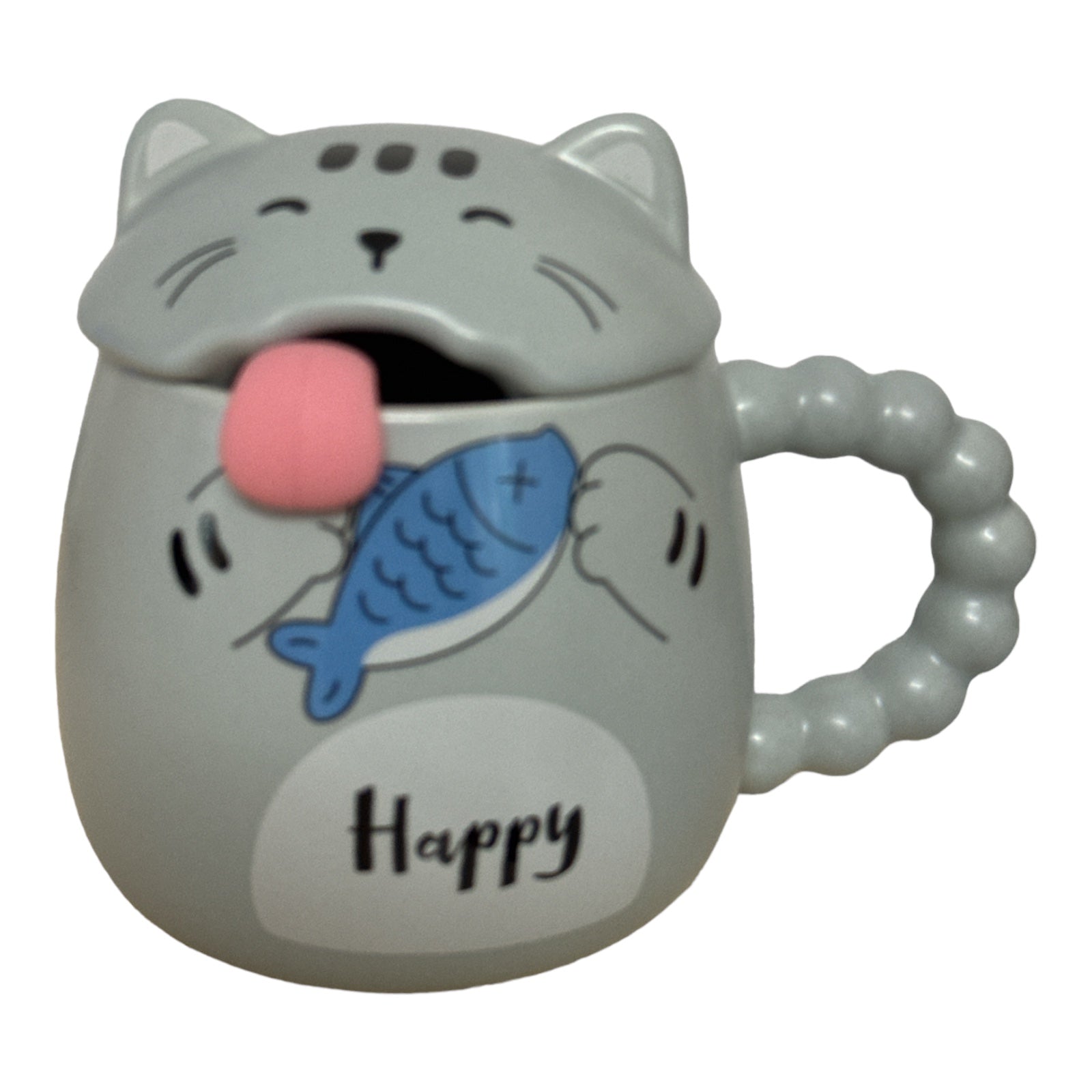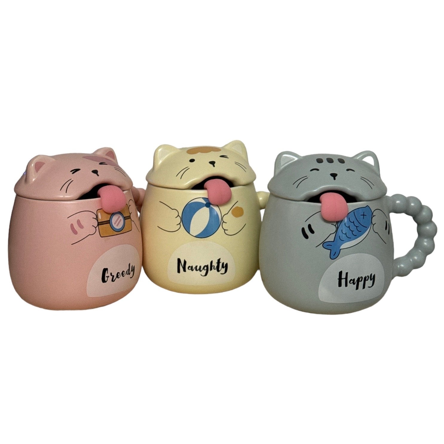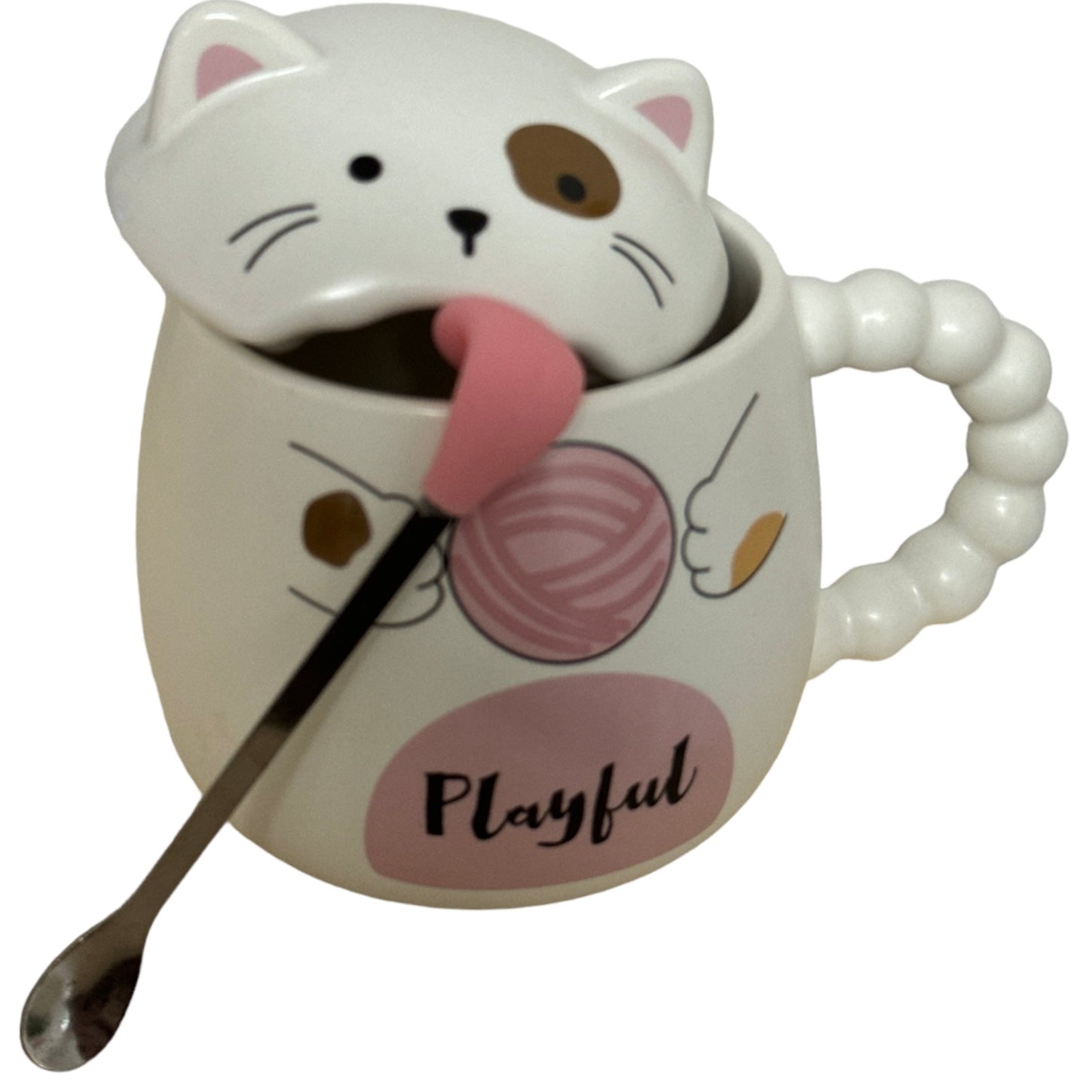 Setul este format dintr-o cană cu linguriță în formă de limbuță de pisică cu un capac haios cu cap de pisică și vine ambalat într-o cutie albă.