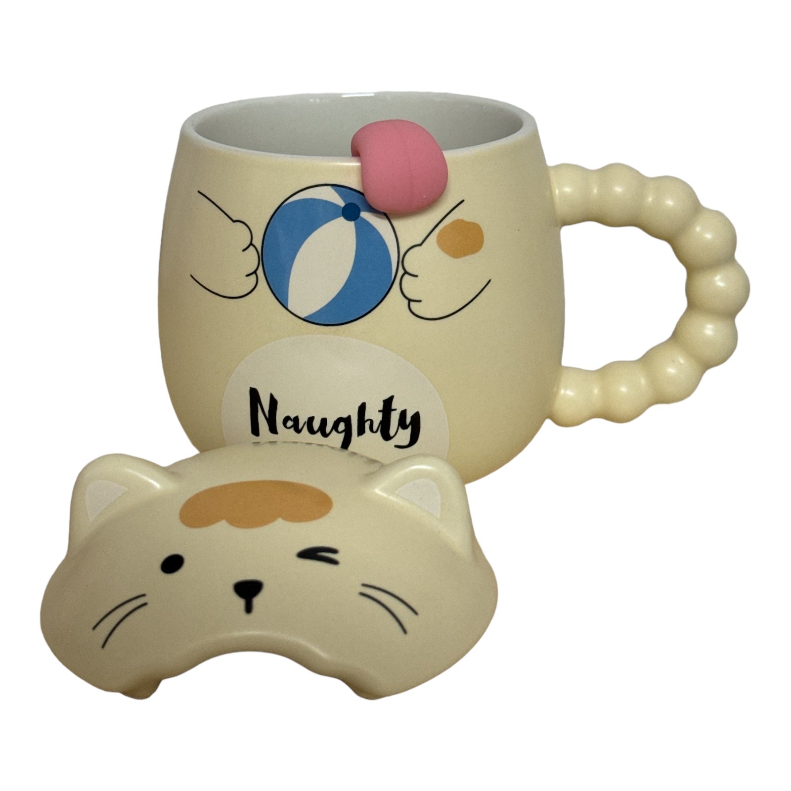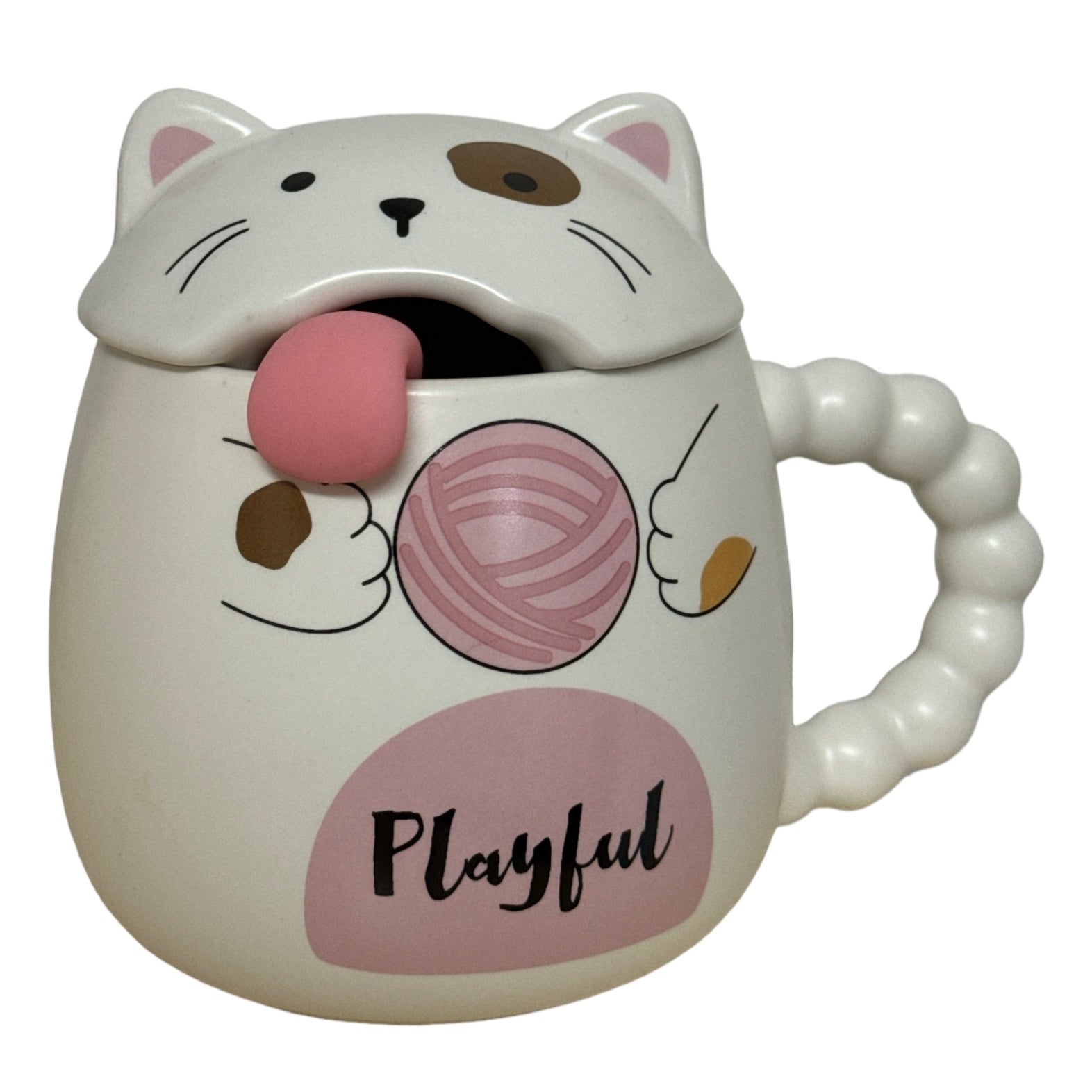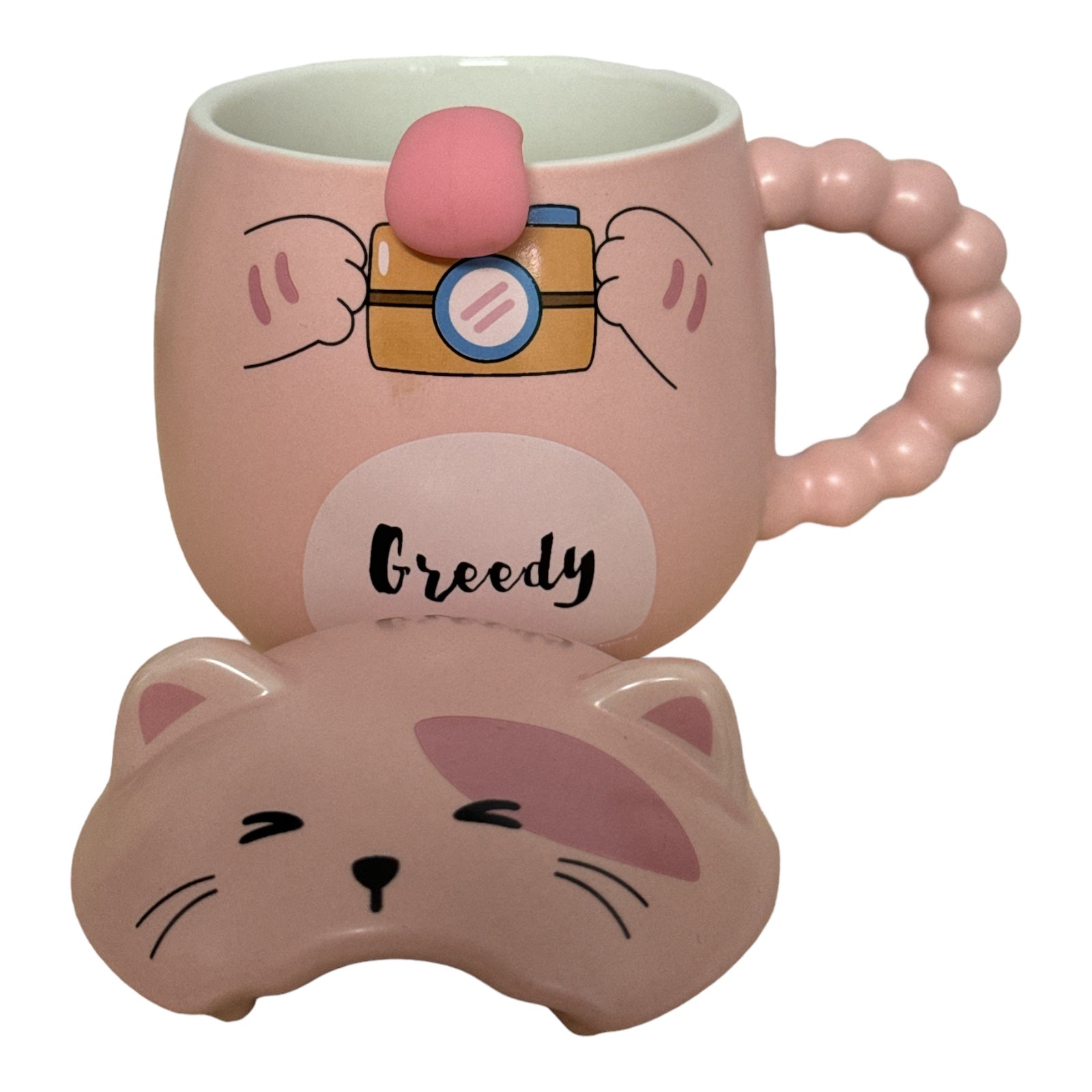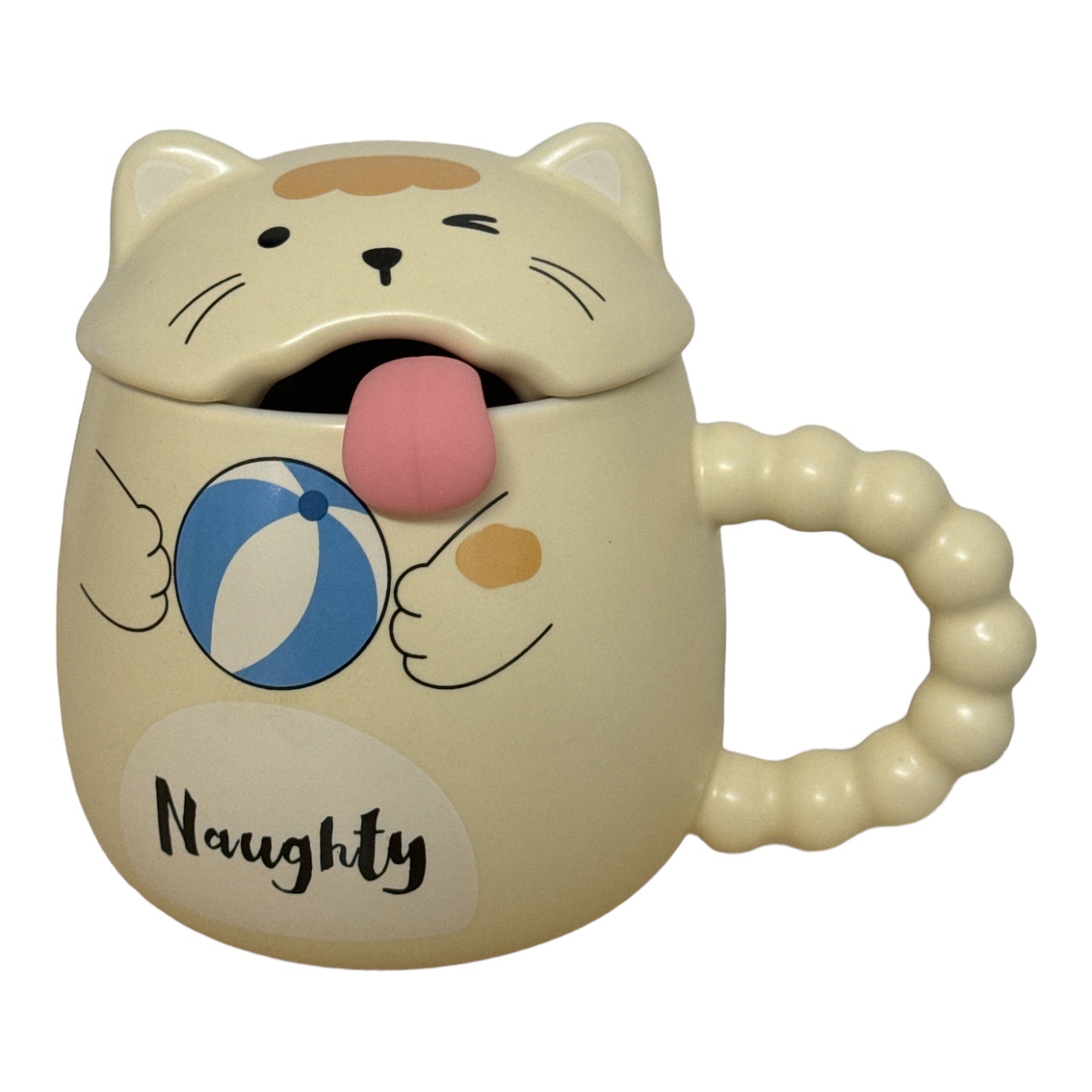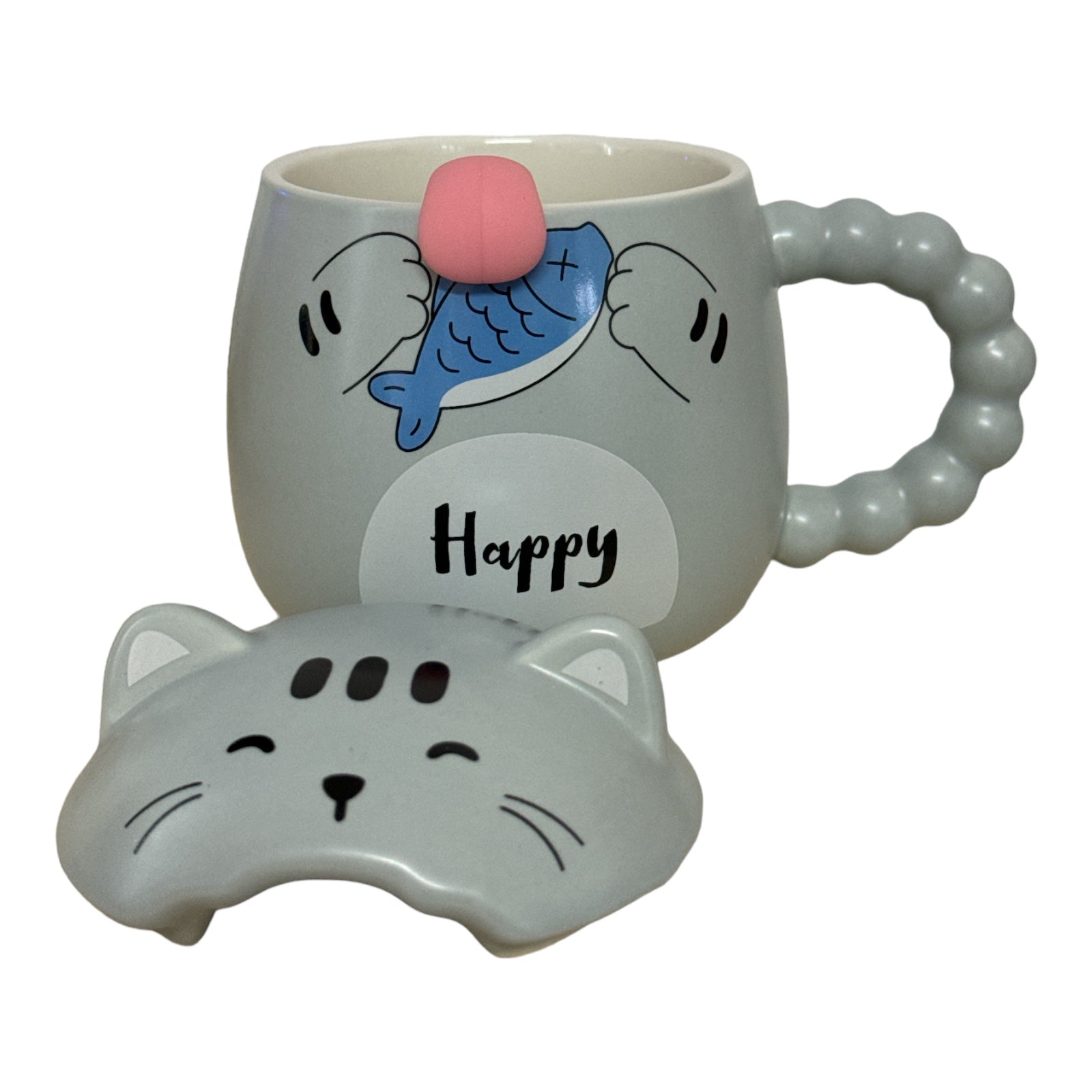 Setul este format dintr-o cană cu linguriță în formă de limbuță de pisică cu un capac haios cu cap de pisică și vine ambalat într-o cutie albă.
