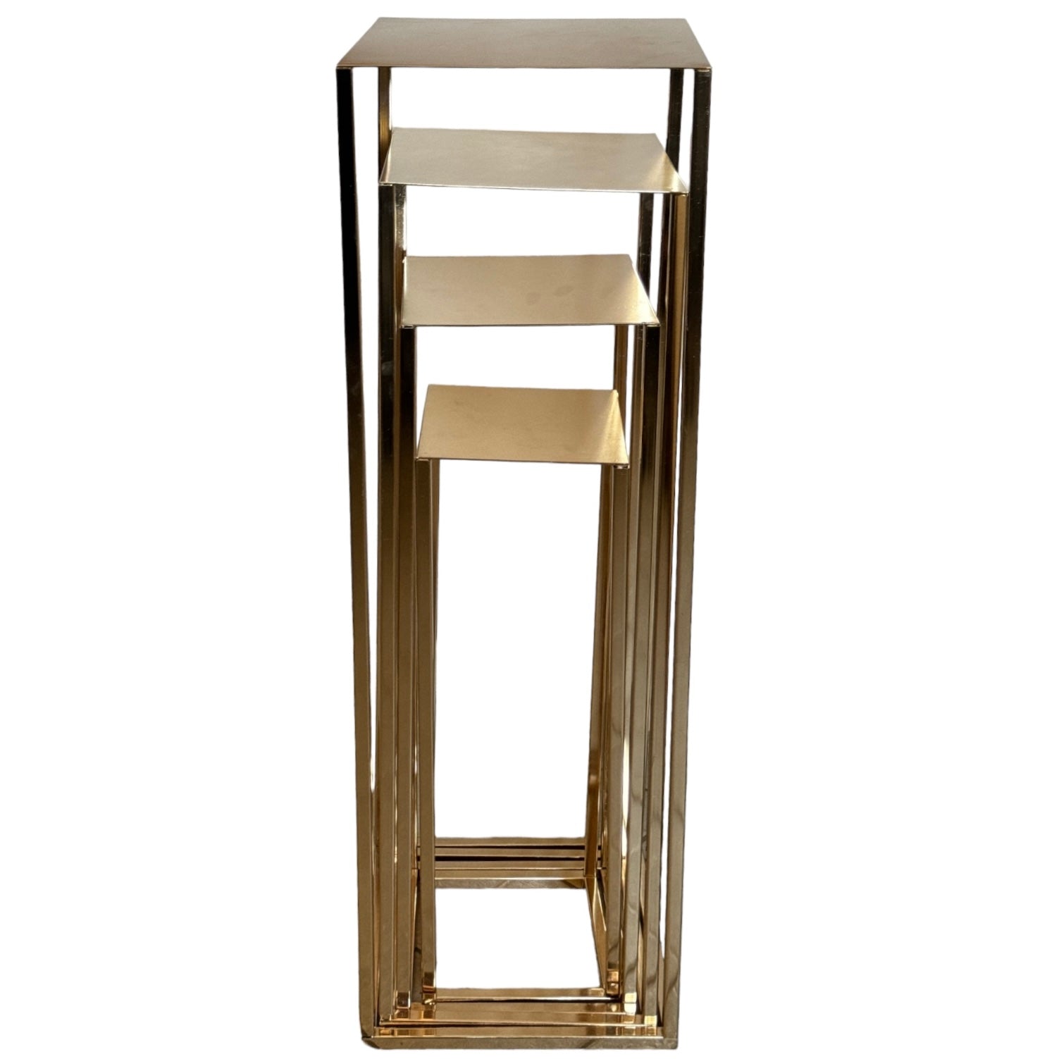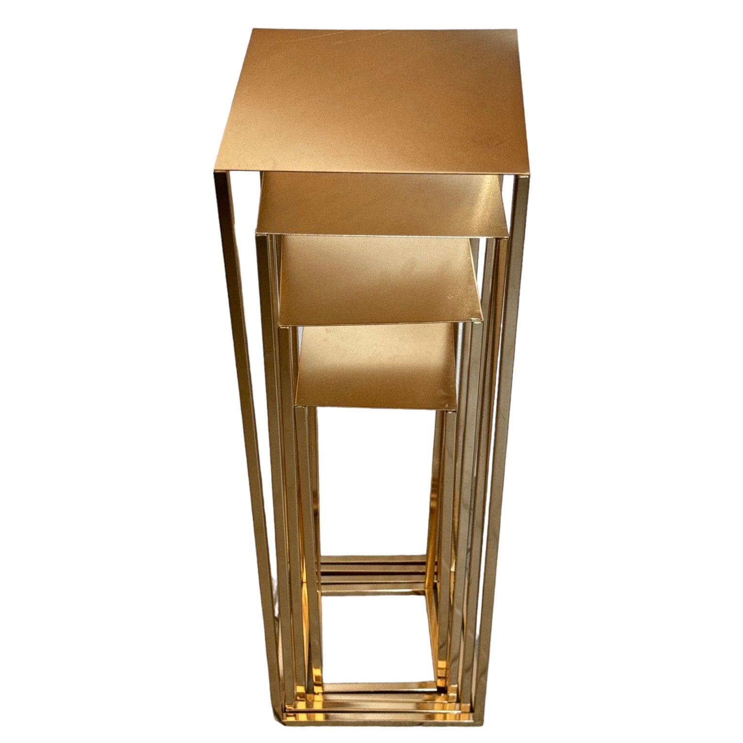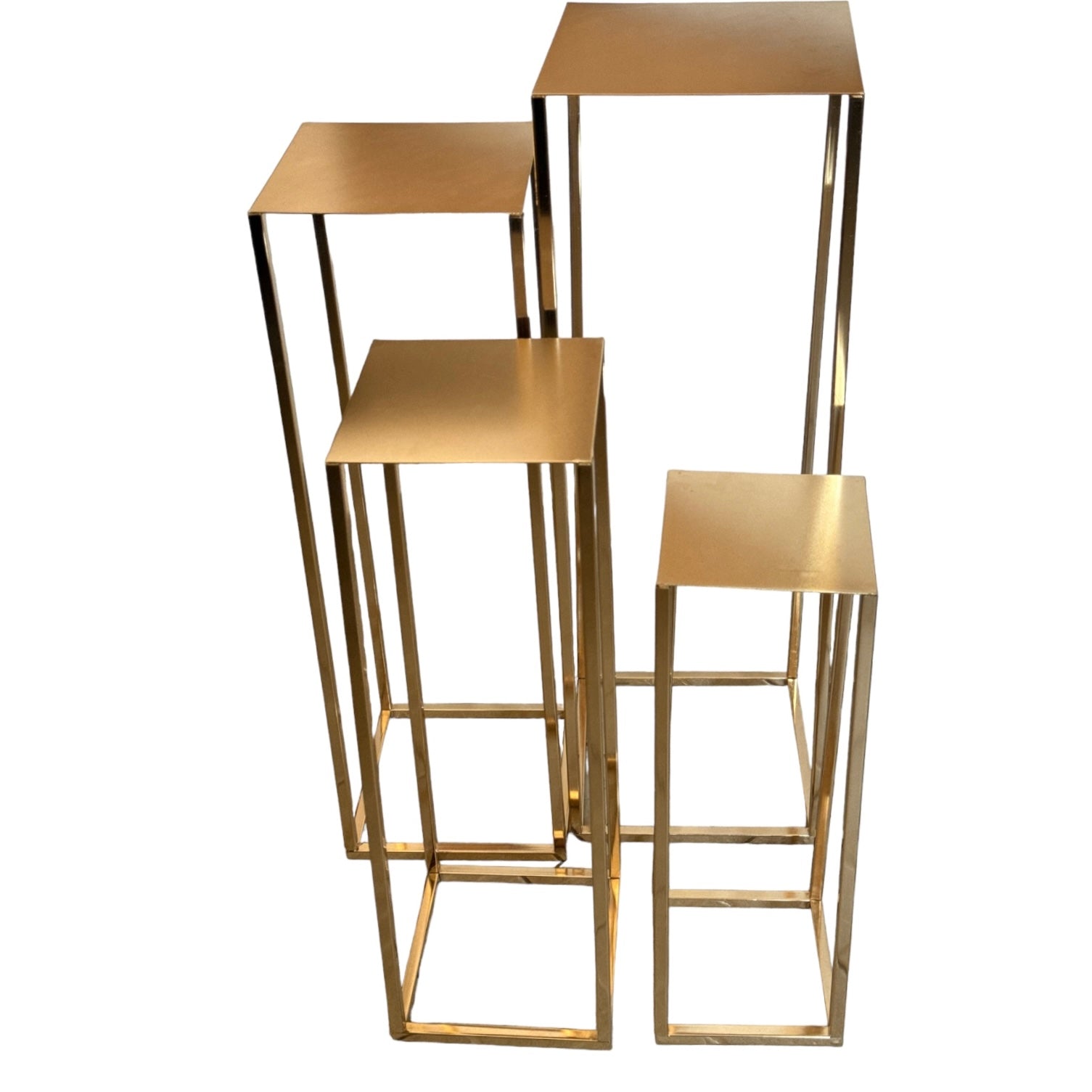 Adăugați un strop de modernitate și eleganță spațiului vostru cu acest set de mese metalice pătrate. Acest set include patru mese de dimensiuni diferite, care se îmbină perfect pentru a obține un efect vizual sofisticat și practic. Fabricate din metal durabil, aceste mese sunt ideale pentru a expune plante, obiecte decorative sau a servi ca suporturi elegante pentru diverse articole.