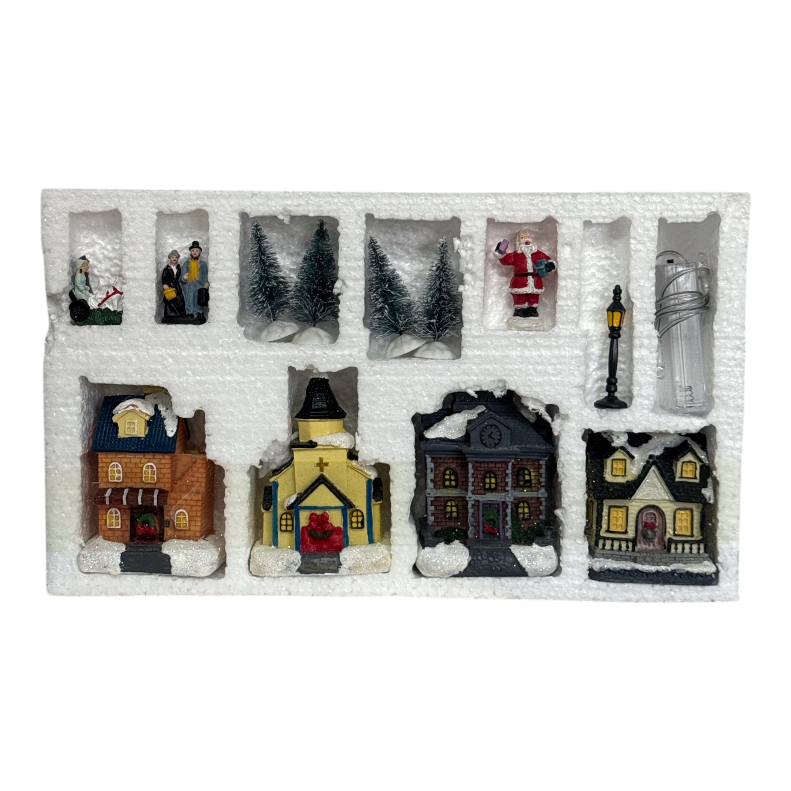 Adaugă magie sărbătorilor tale cu acest set de decorațiuni festive reprezentând un sat de iarnă.
