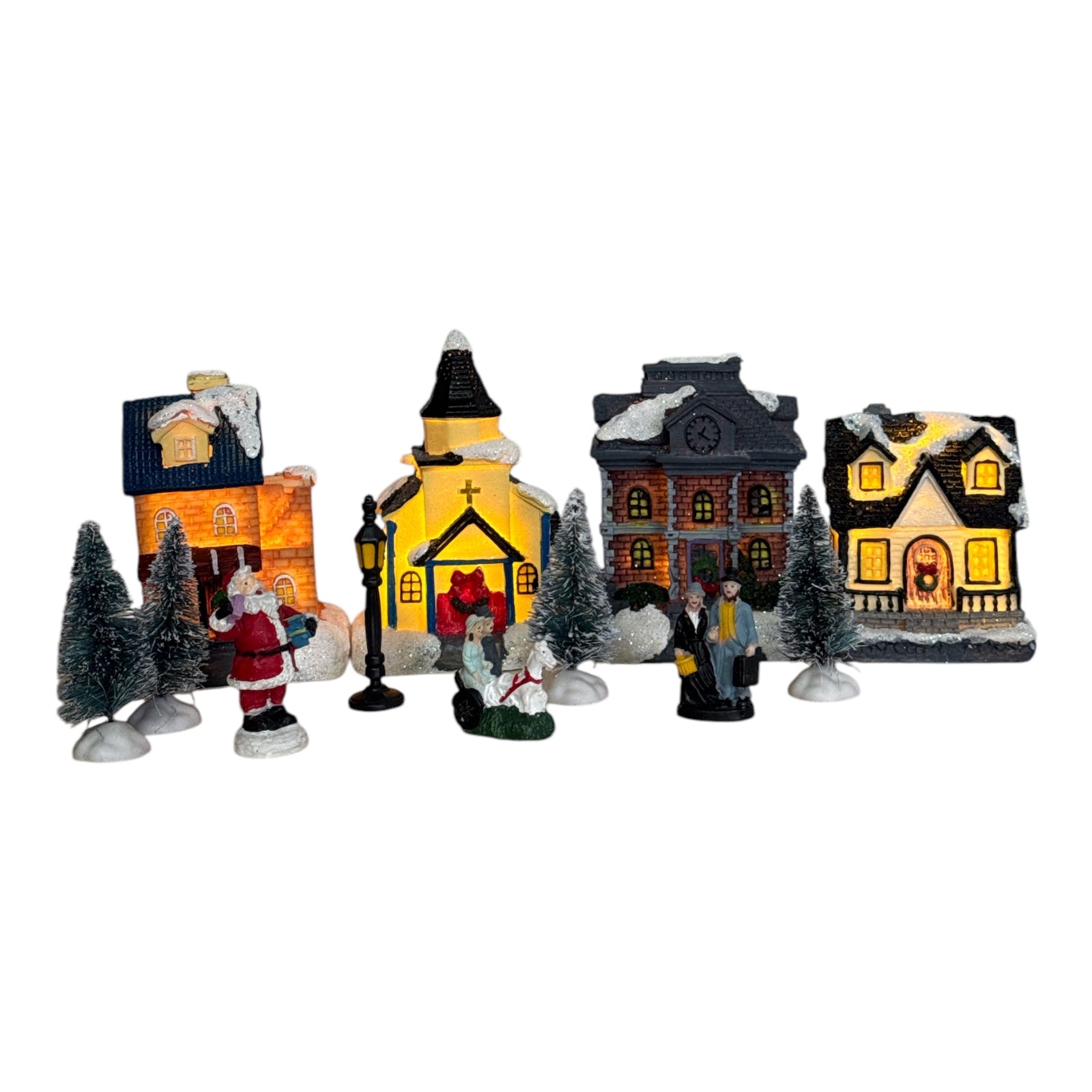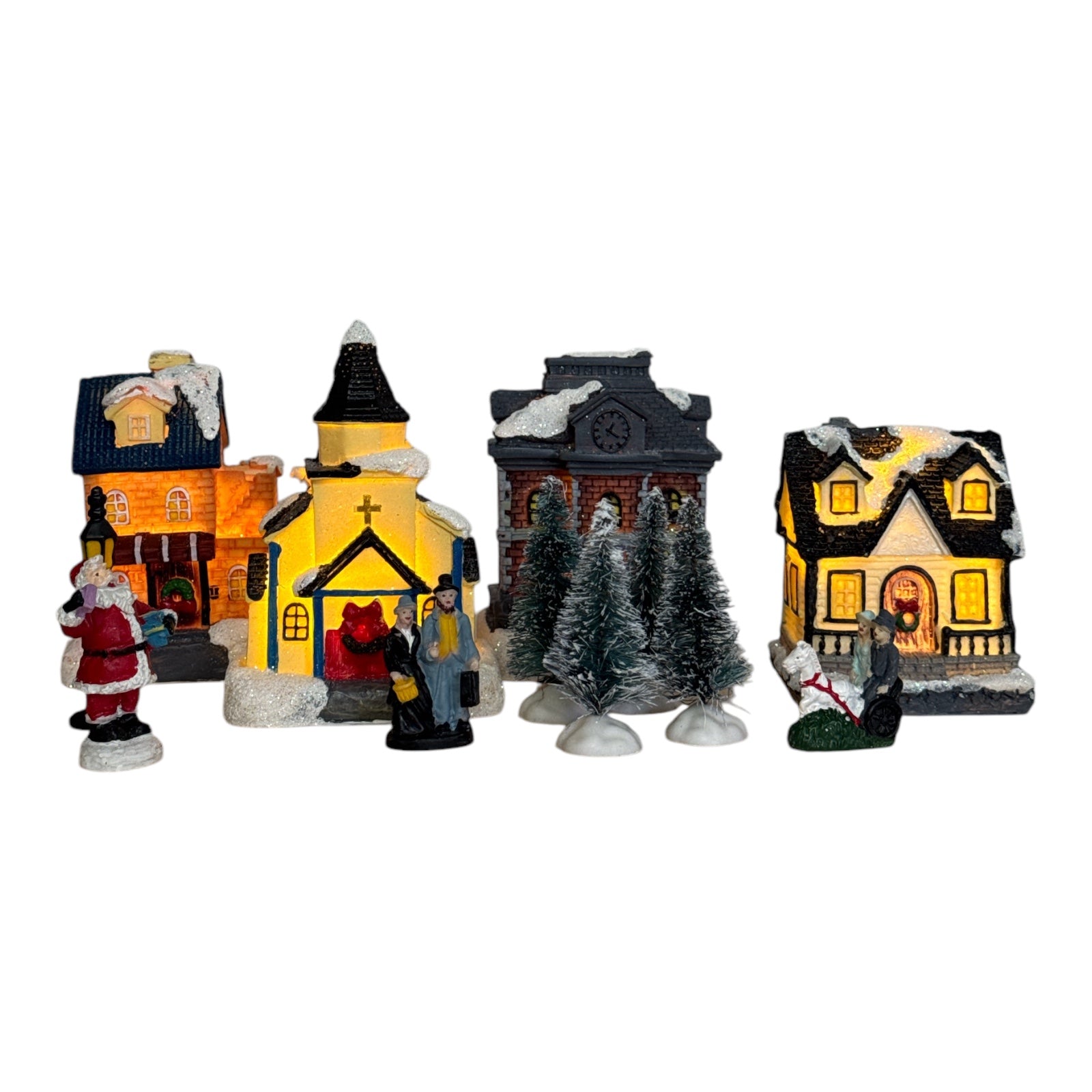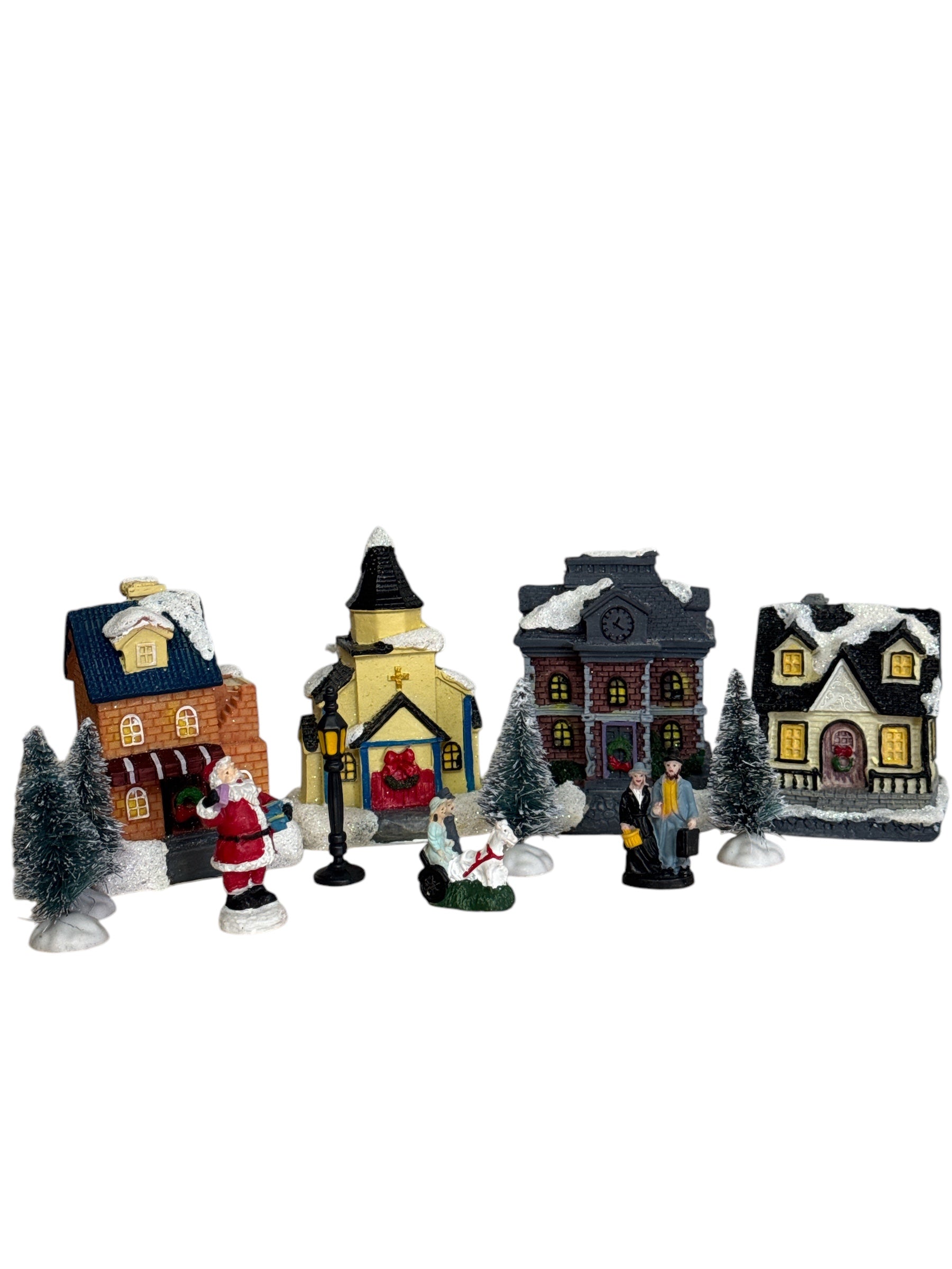 Include case și biserică luminate, brazi împodobiți cu zăpadă artificială și figurine de sărbători.