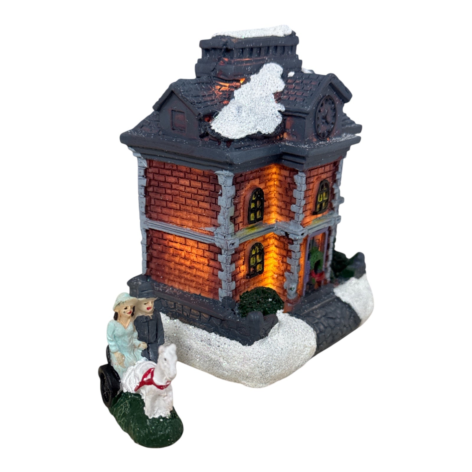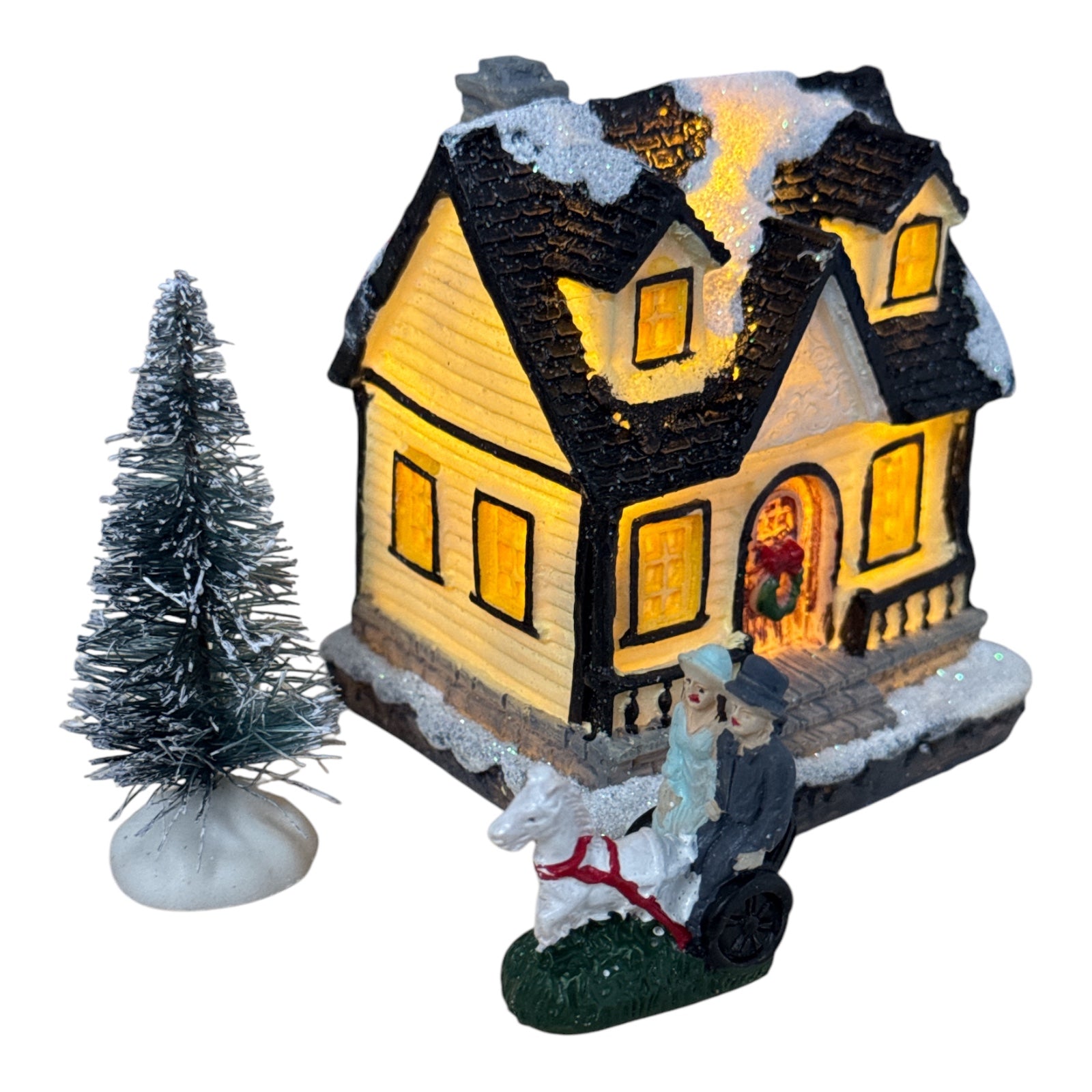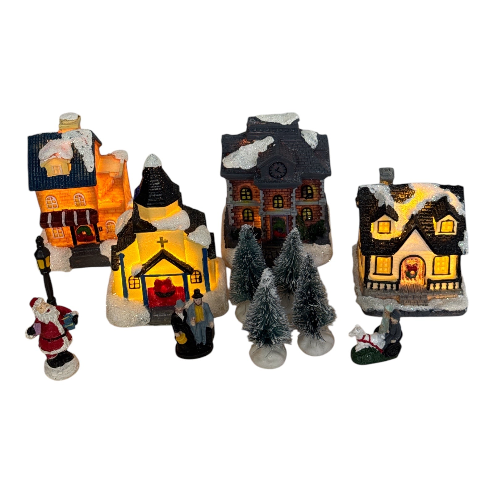 Include case și biserică luminate, brazi împodobiți cu zăpadă artificială și figurine de sărbători.