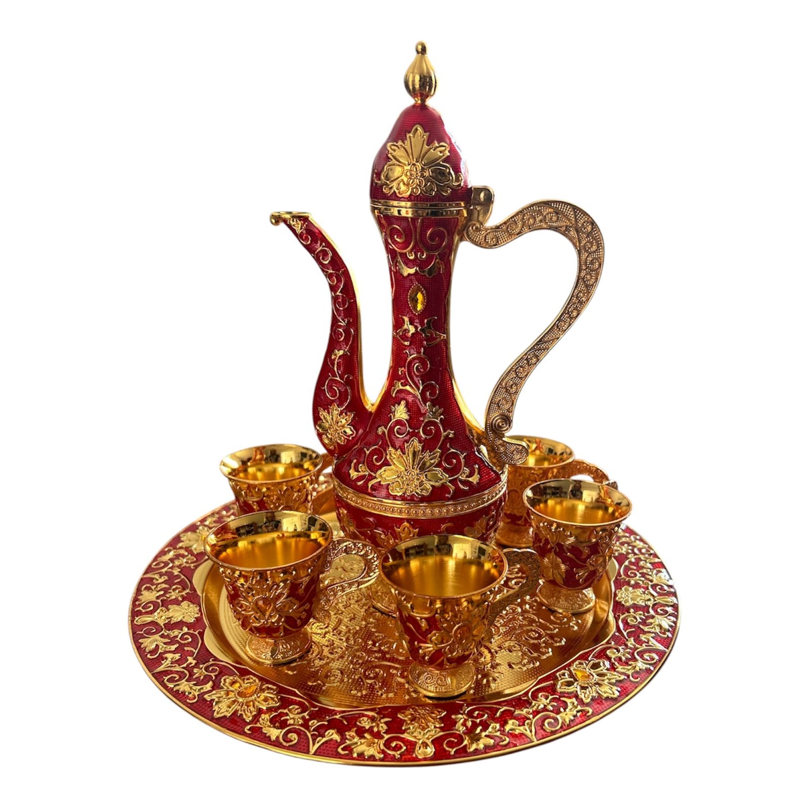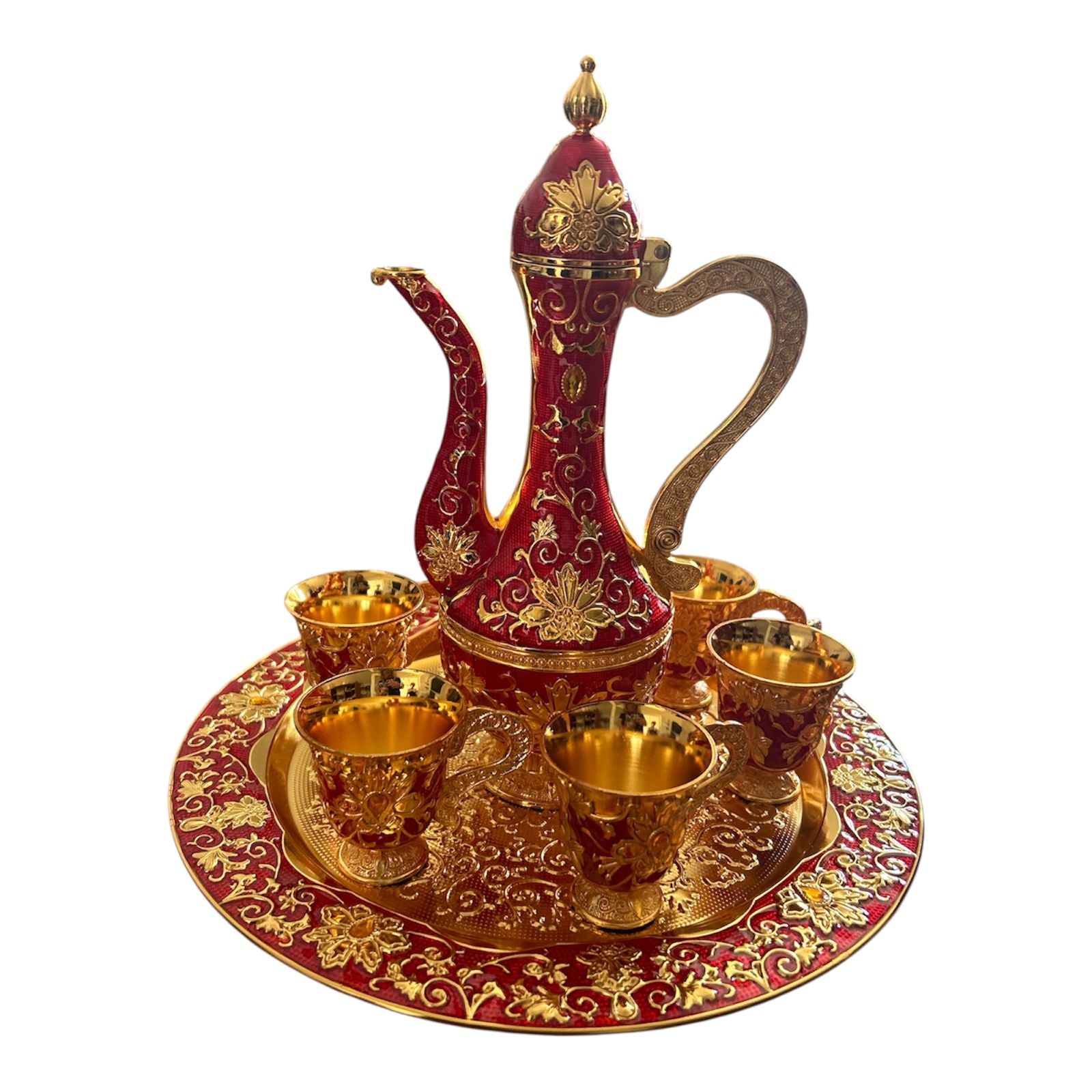 Adu eleganța orientală în casa ta cu acest set rafinat de servire, format din 7 piese: tavă, carafă decorativă și 6 ceșcuțe . Designul este inspirat din stilul tradițional arab și realizat cu un nivel înalt de detaliu, ideal pentru ocazii speciale, decor sau cadouri deosebite.