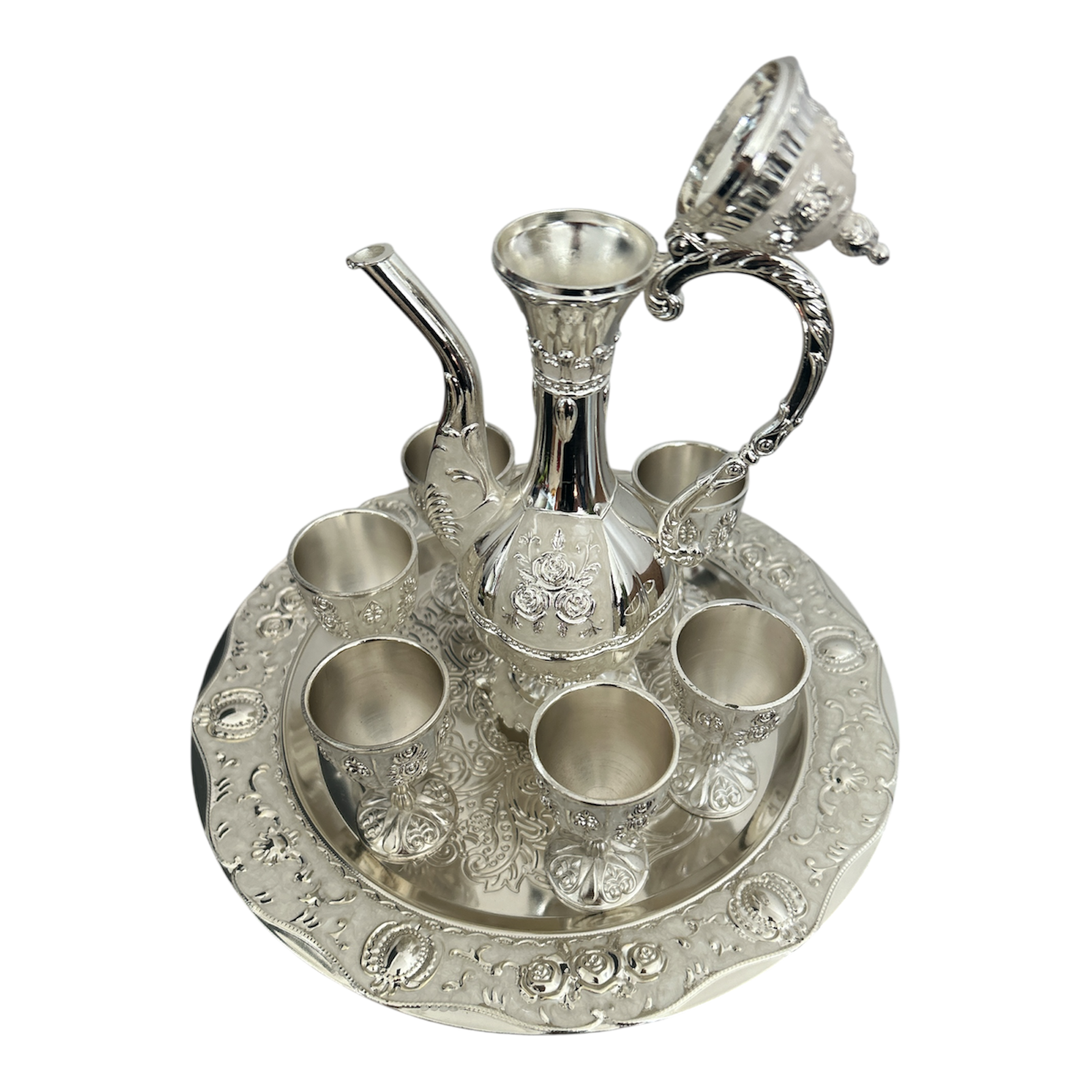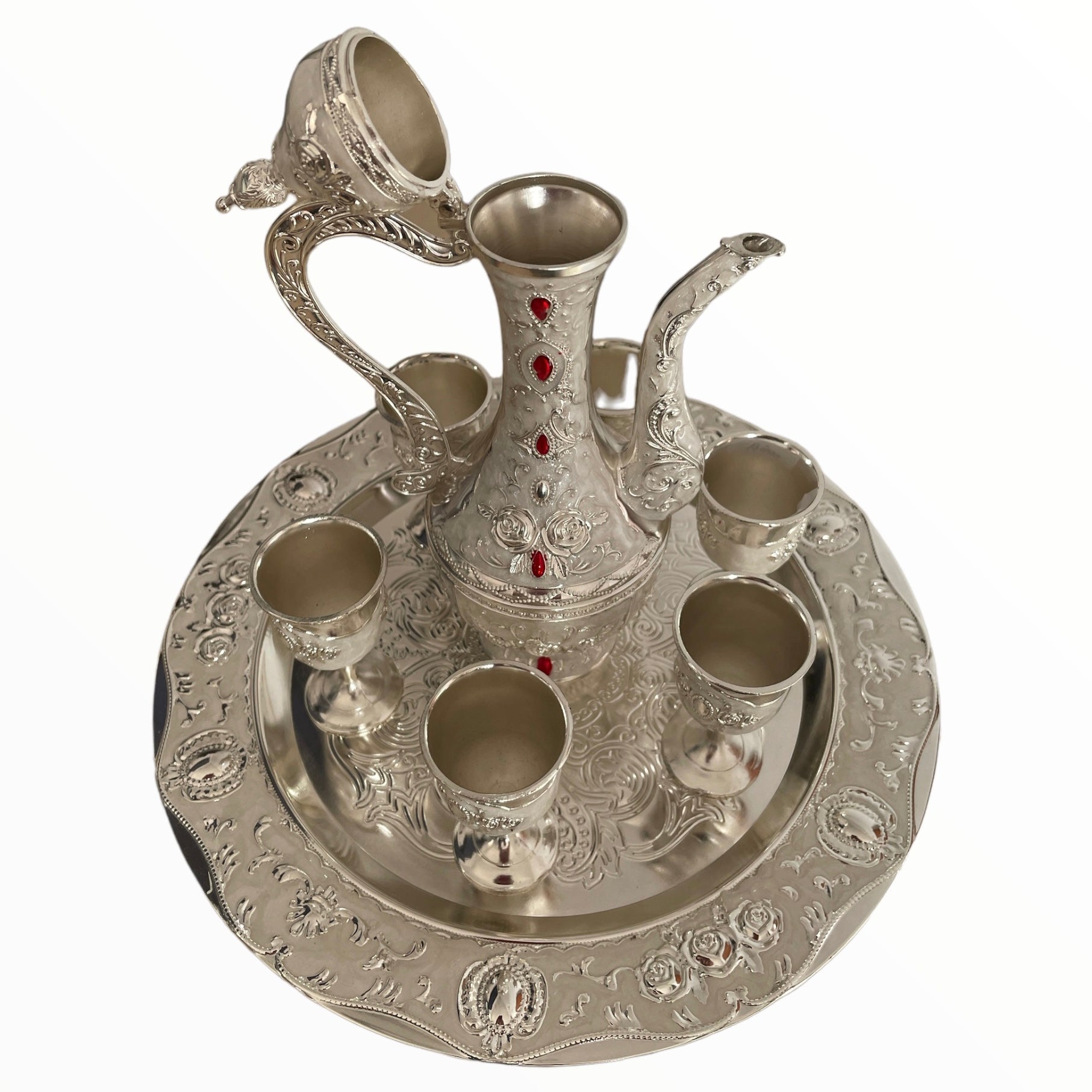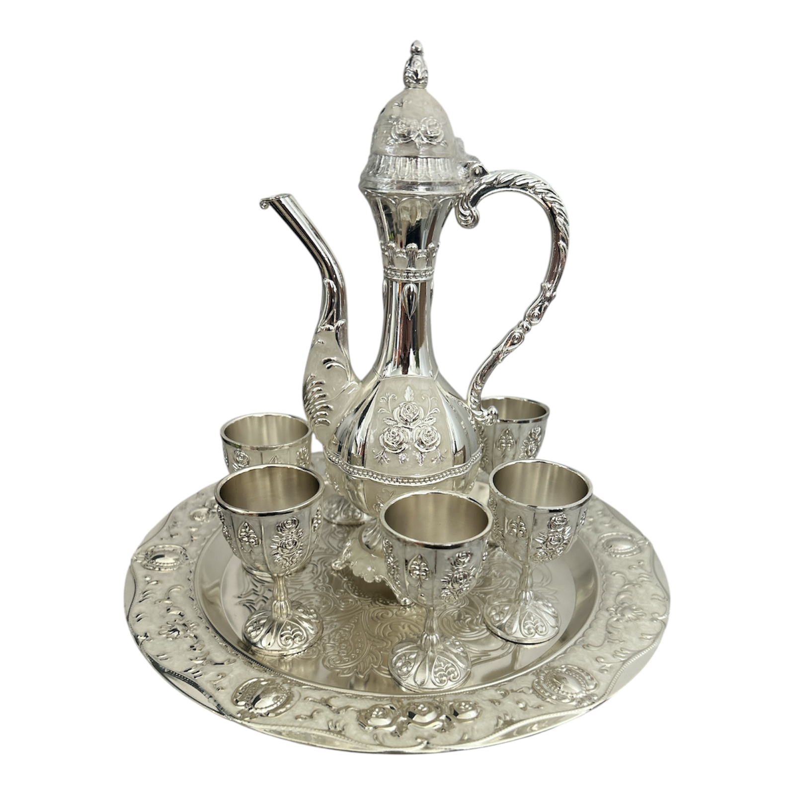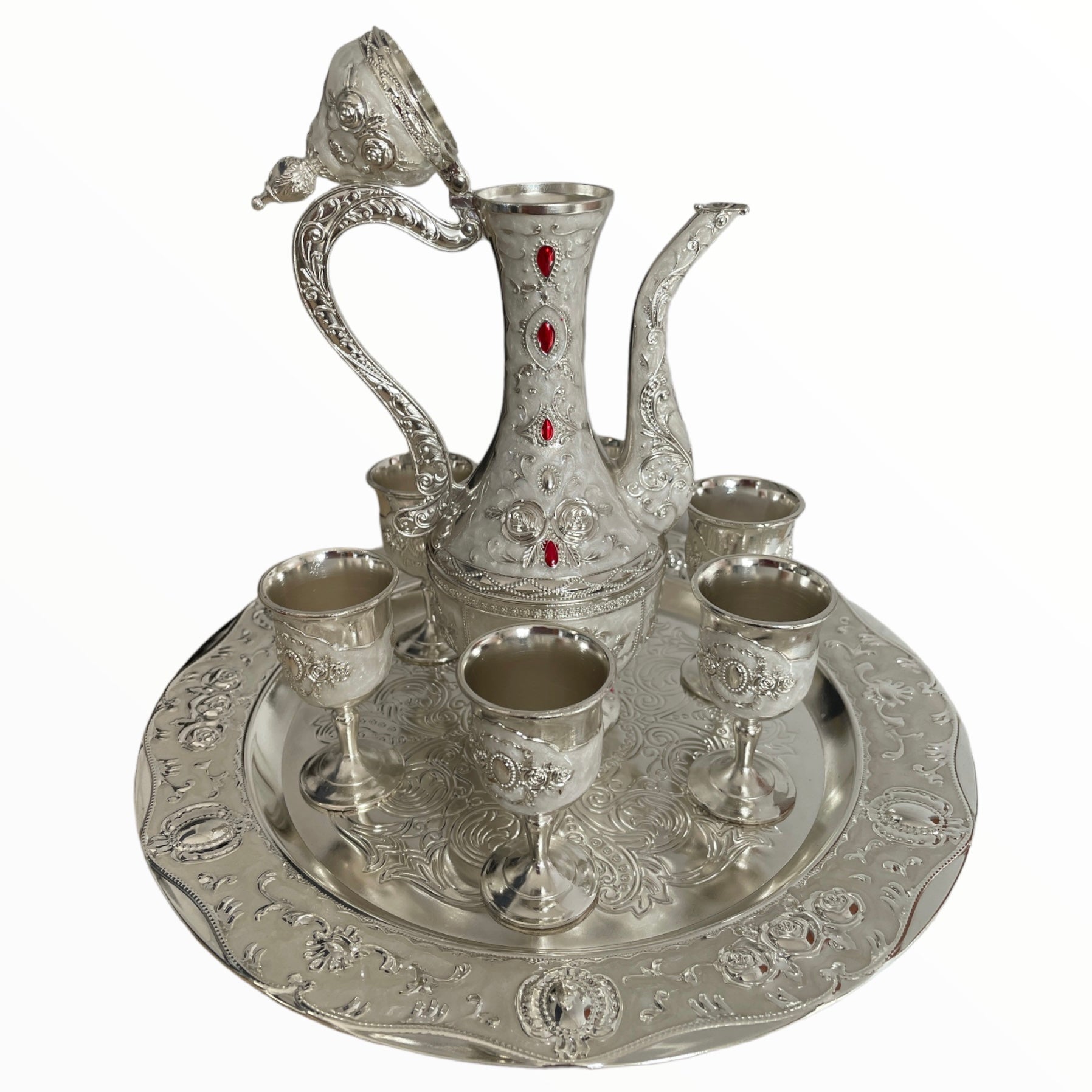 Confecționat din alpaca, setul cu carafă și pahare are un design rafinat datorită culorii antichizate. Este o piesă elegantă și utilă, care te va ajuta să creezi un decor Vintage.