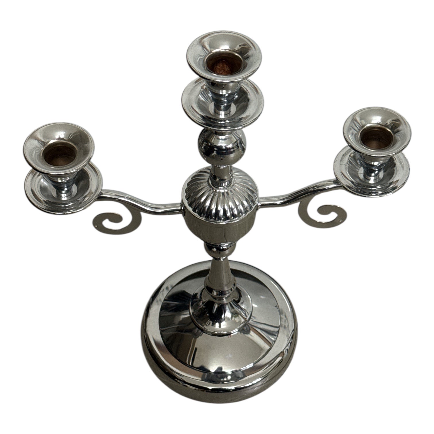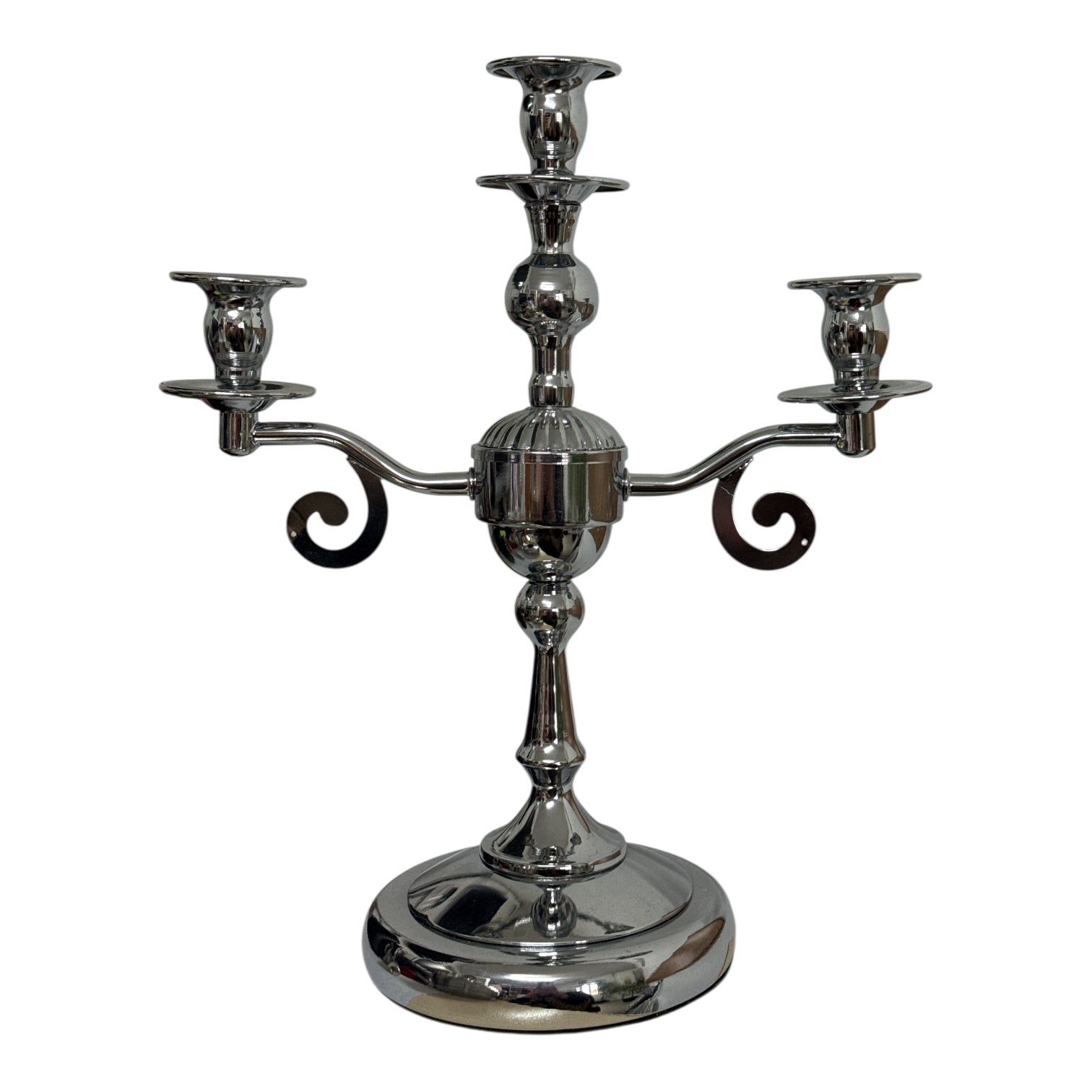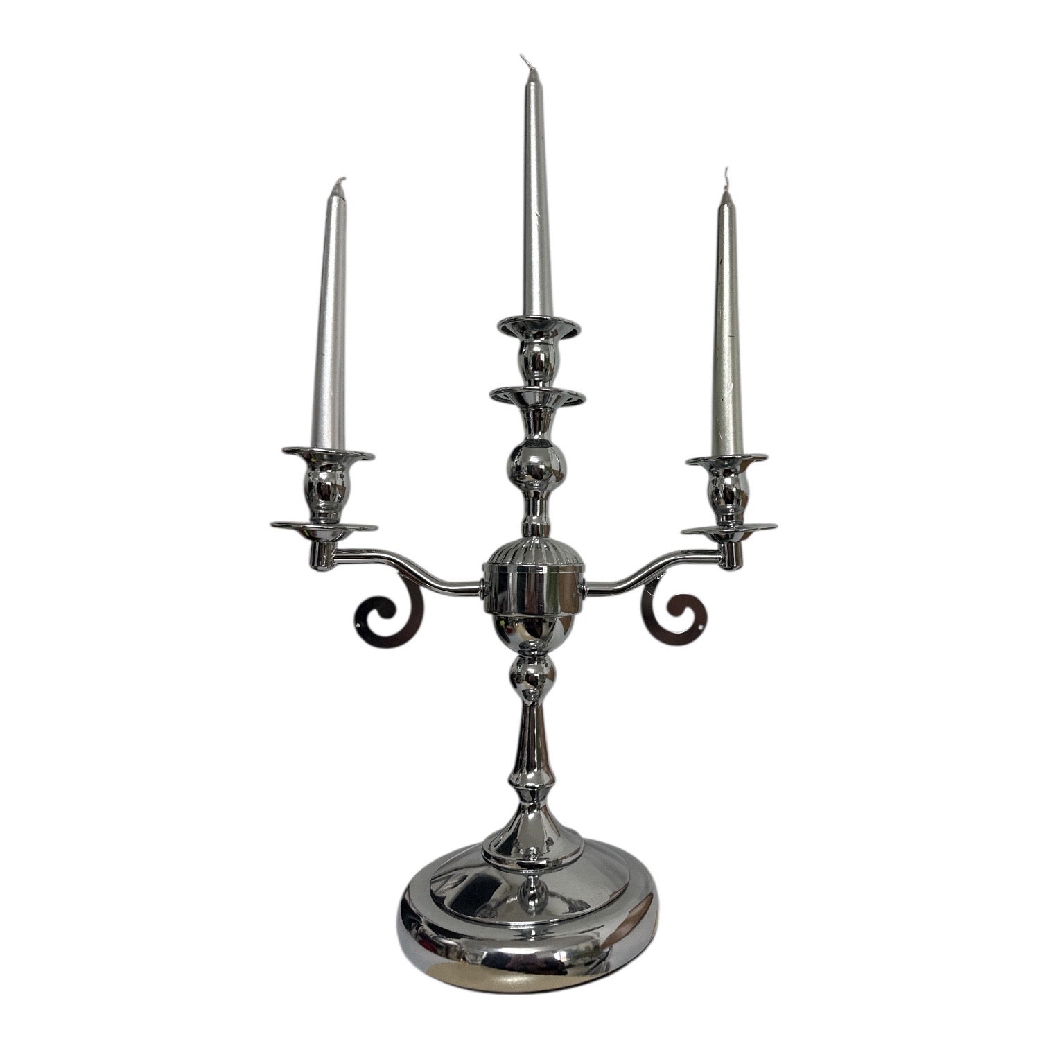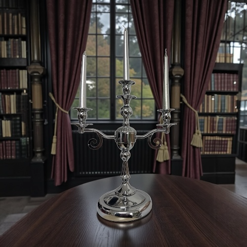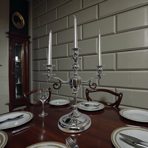 Adaugă un plus de rafinament decorului tău cu acest sfeșnic metalic cu trei brațe, realizat într-un stil clasic, cu finisaj cromat lucios. Designul său echilibrat și detaliile atent lucrate îl transformă într-o piesă decorativă elegantă, ideală pentru mese festive, console, bufete sau decoruri romantice.