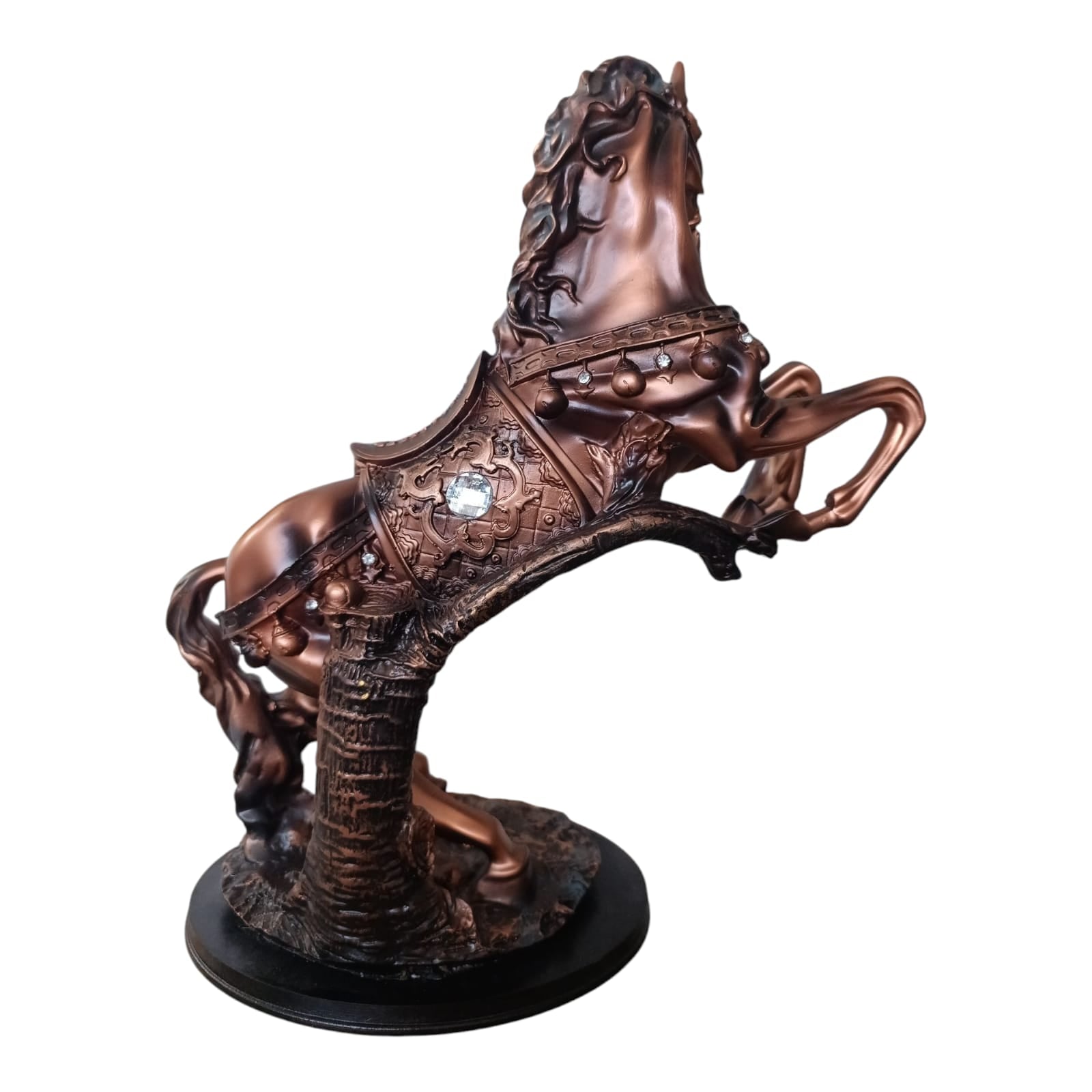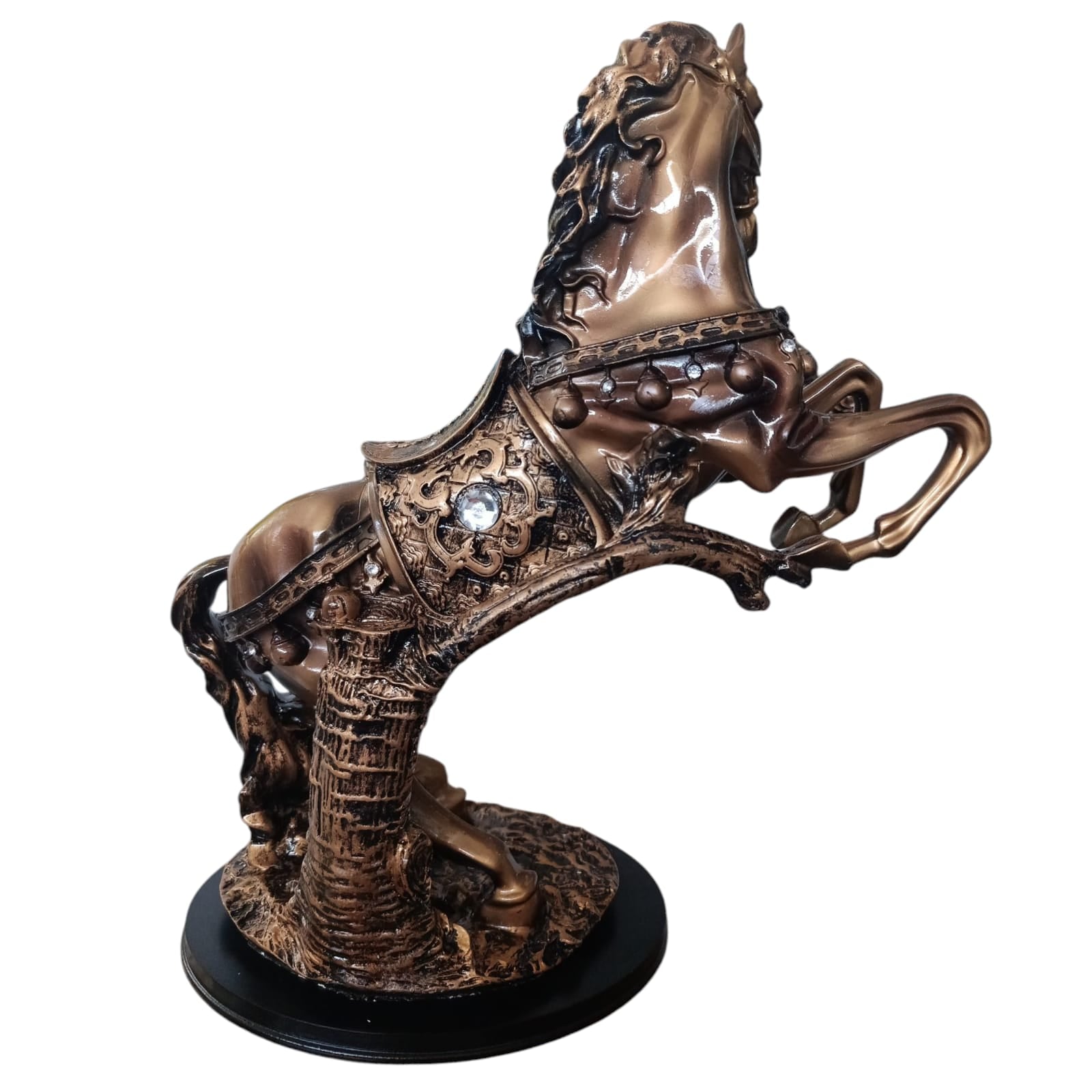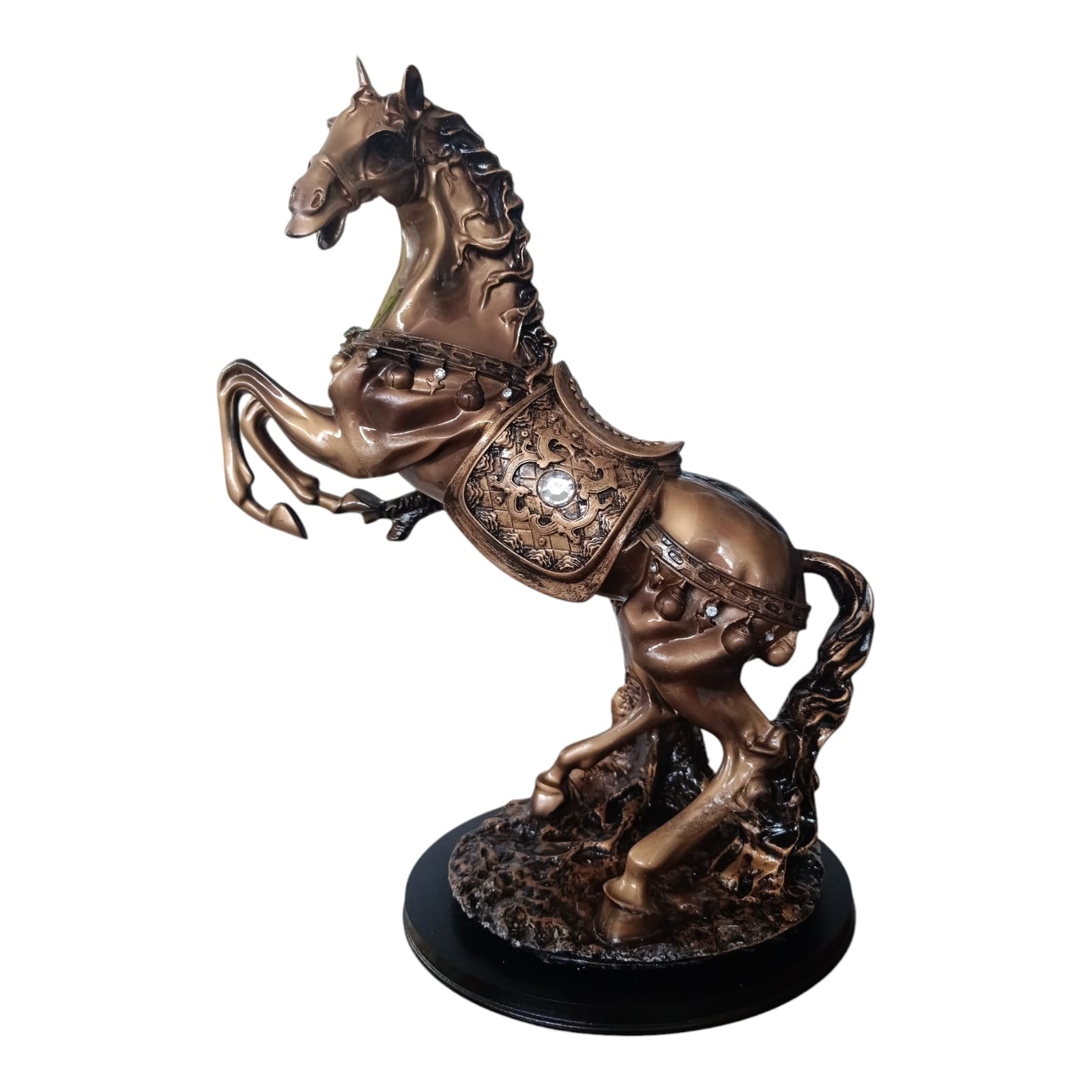 Această impresionantă statuetă reprezintă un cal cabrat, ornamentat cu o șa și ham bogat decorate și împodobite cu pietre fine, adăugând o notă de rafinament și lux. Detaliile minuțioase și atitudinea impunătoare a calului simbolizează succesul, determinarea și măreția.