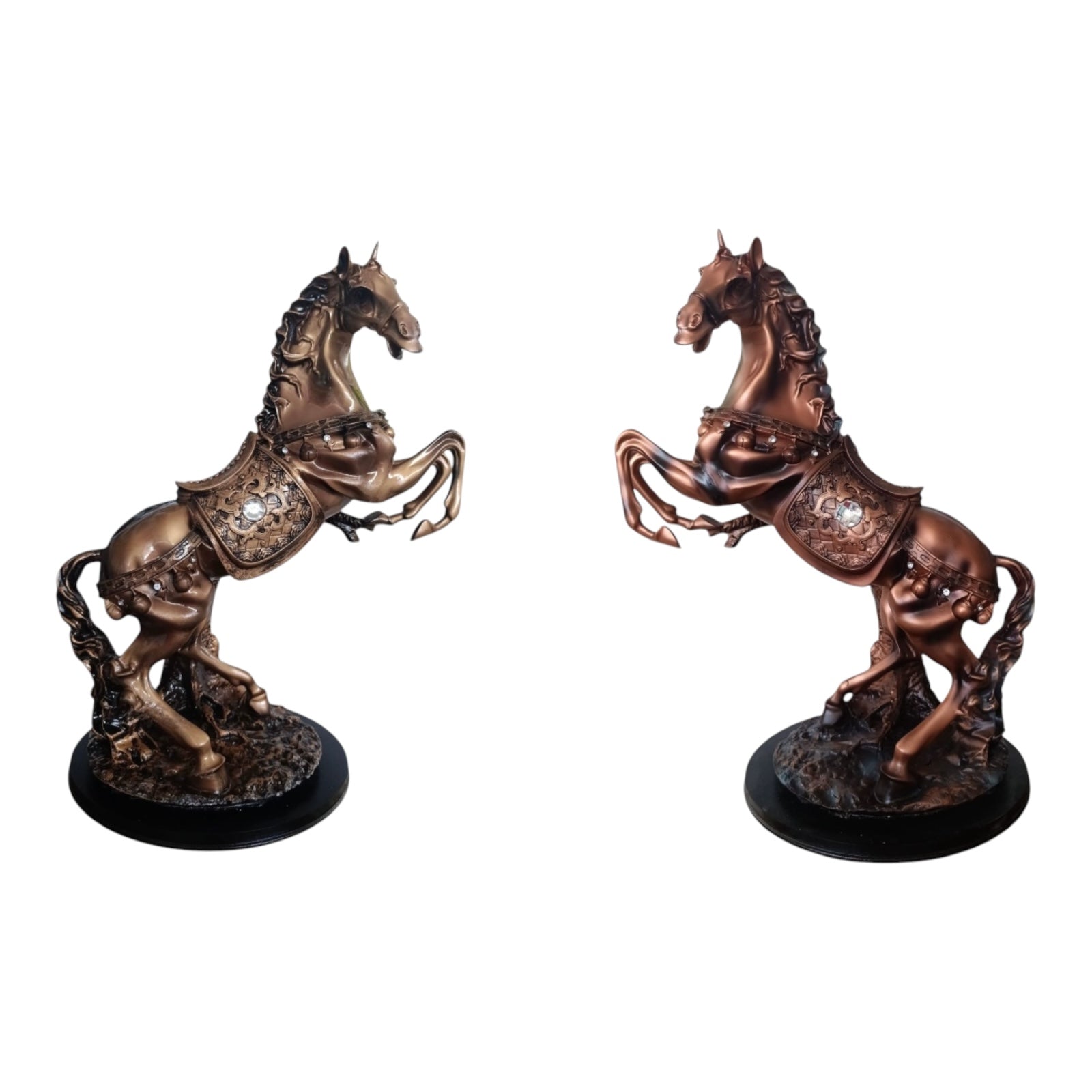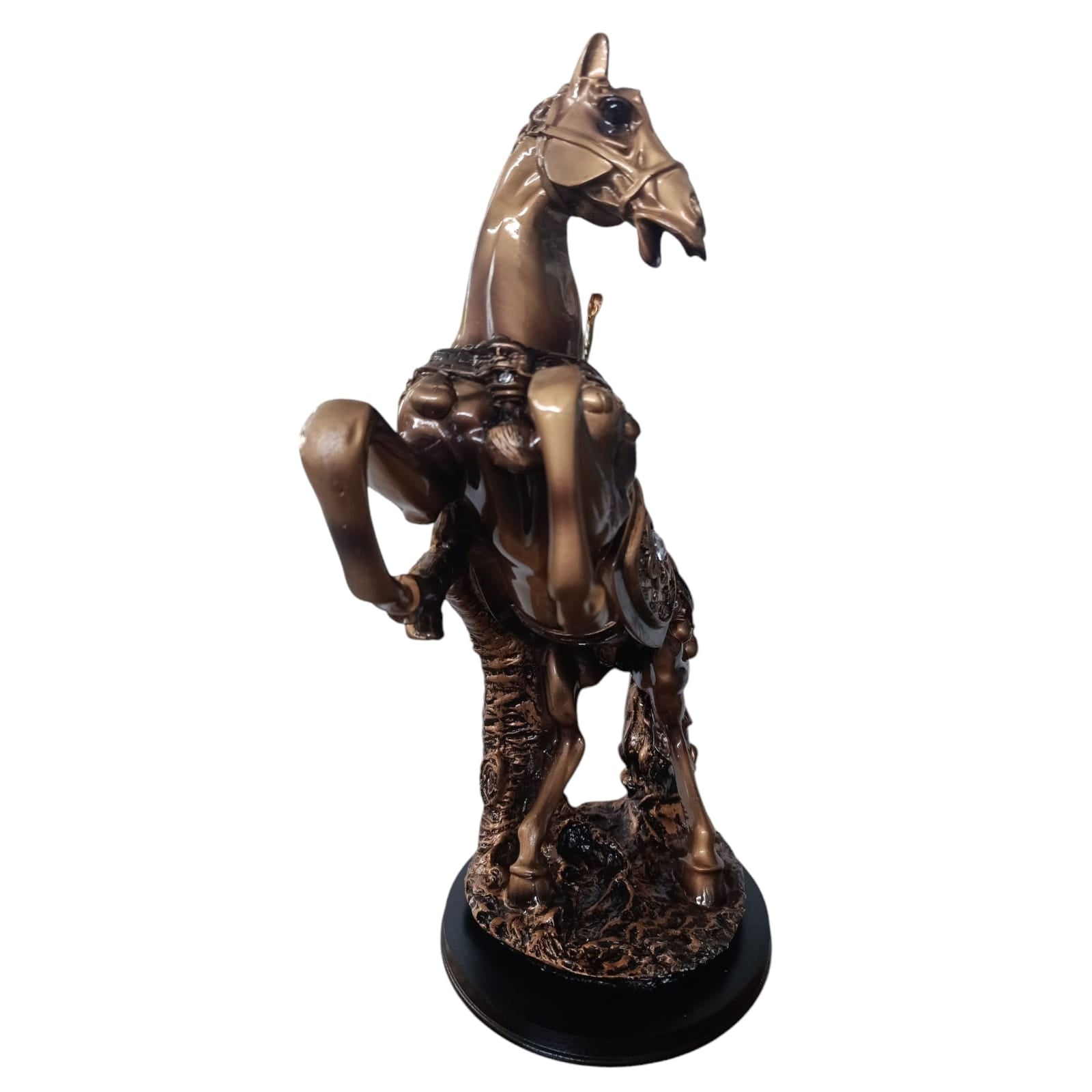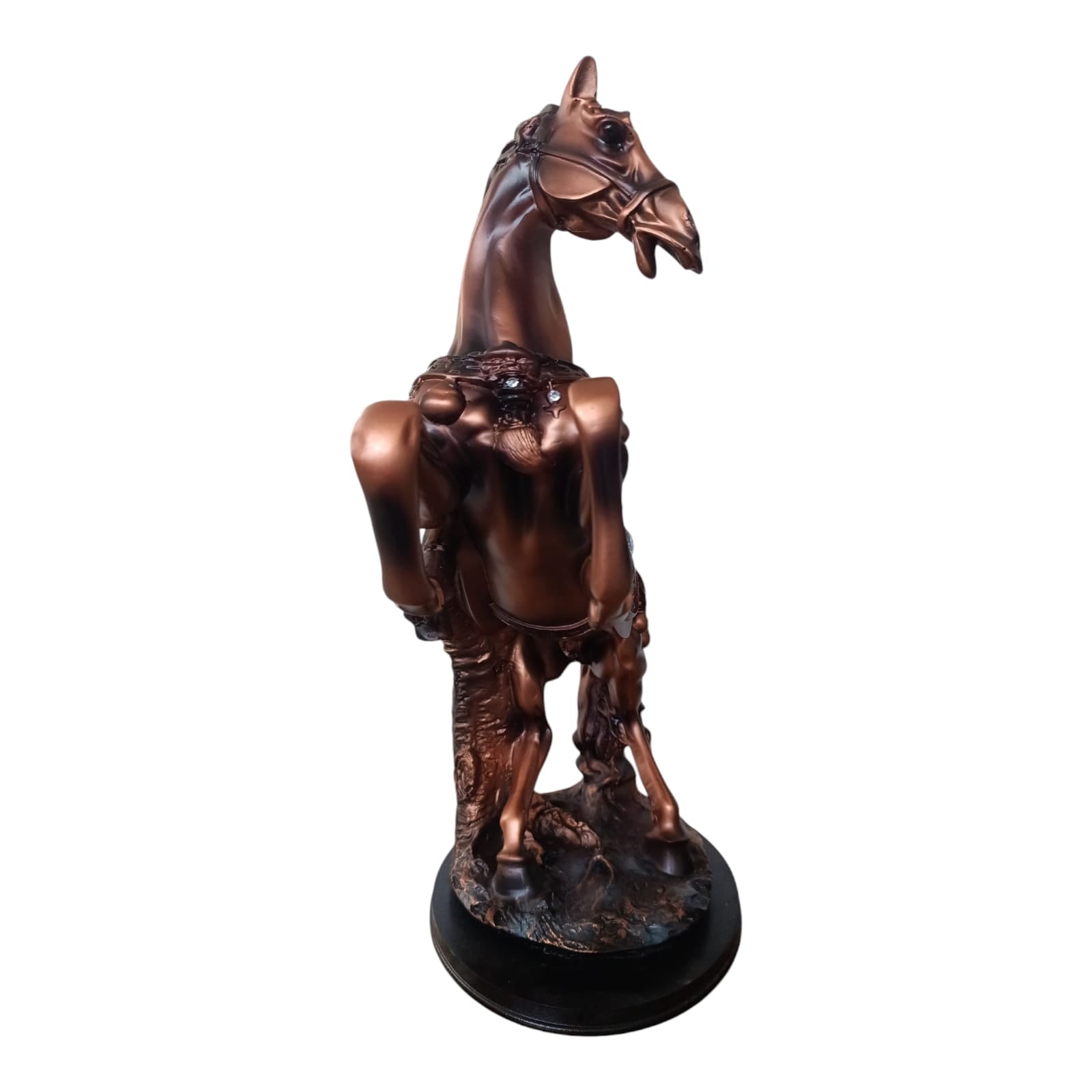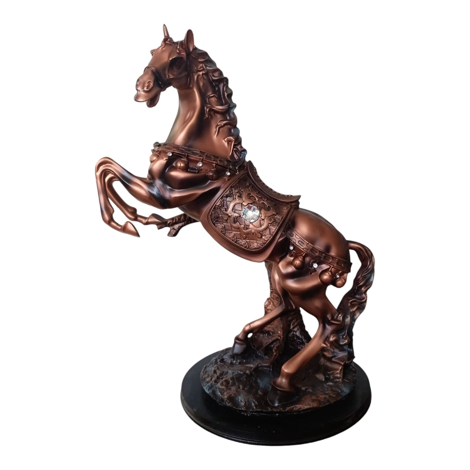 Această impresionantă statuetă reprezintă un cal cabrat, ornamentat cu o șa și ham bogat decorate și împodobite cu pietre fine, adăugând o notă de rafinament și lux. Detaliile minuțioase și atitudinea impunătoare a calului simbolizează succesul, determinarea și măreția.