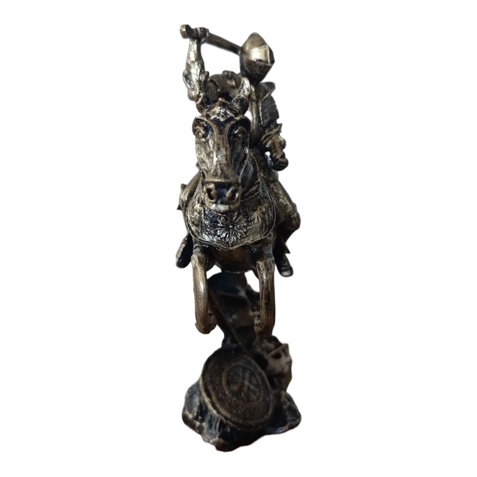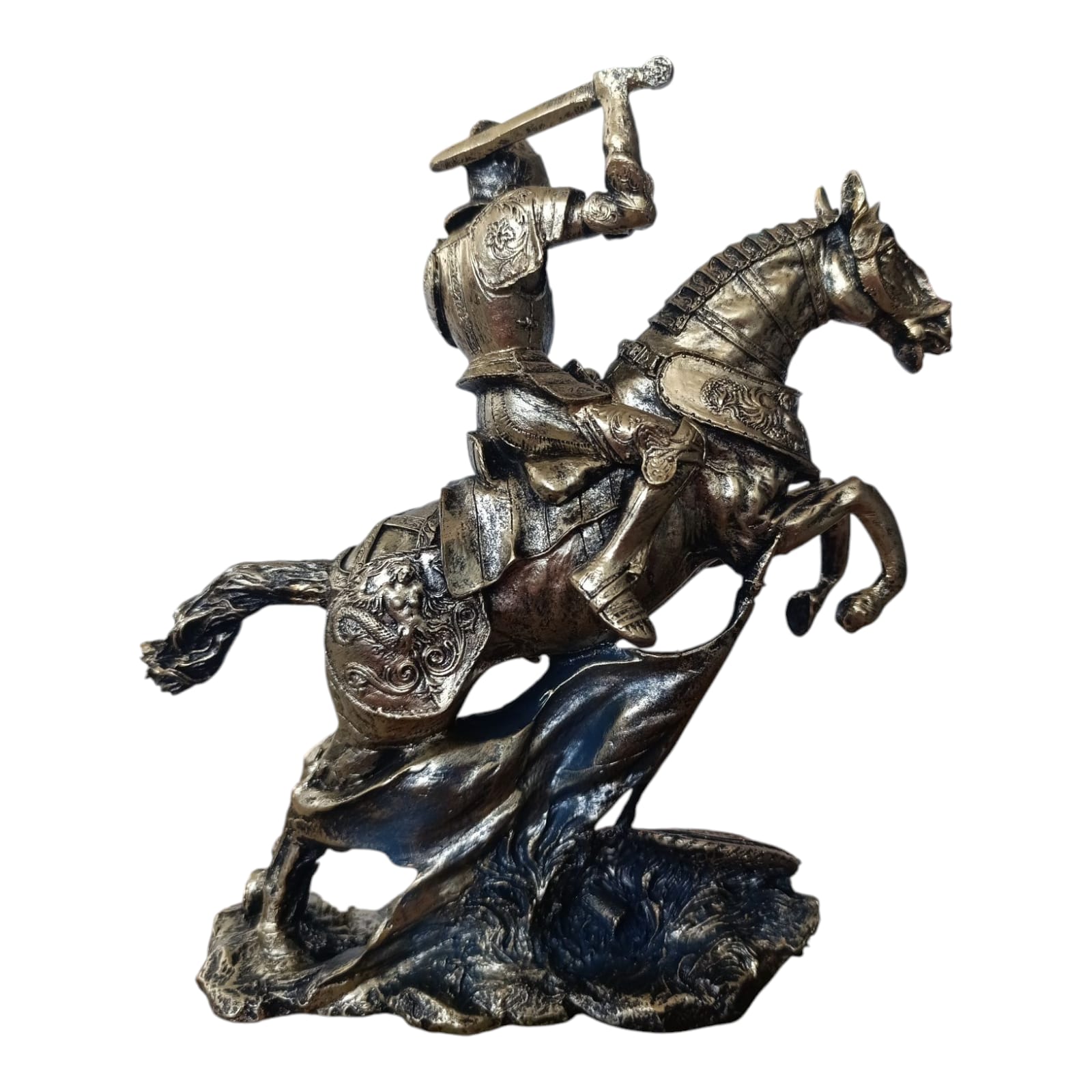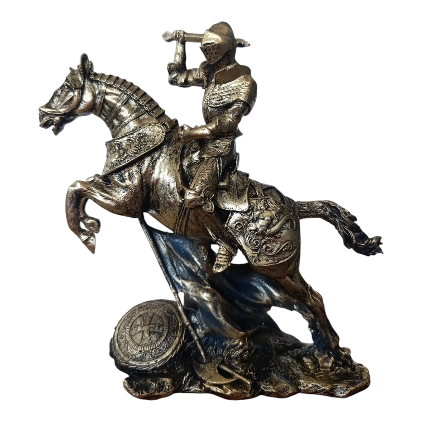 Această statuetă impresionantă îl înfățișează pe un cavaler medieval în armură completă, ridicându-și sabia în timp ce călărește un cal cabrat, gata de luptă. Cu detalii bogate și o execuție artistică remarcabilă, această piesă evocă spiritul eroic, loialitatea și noblețea cavalerească.