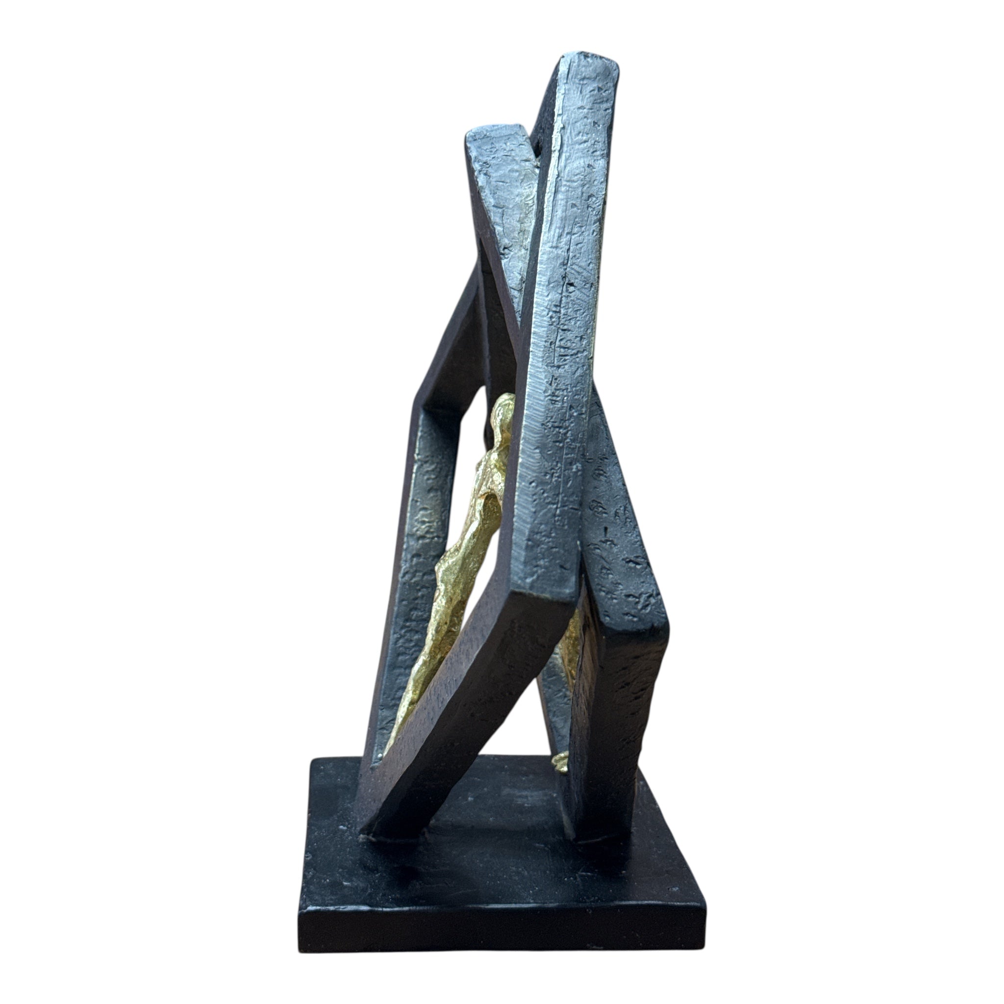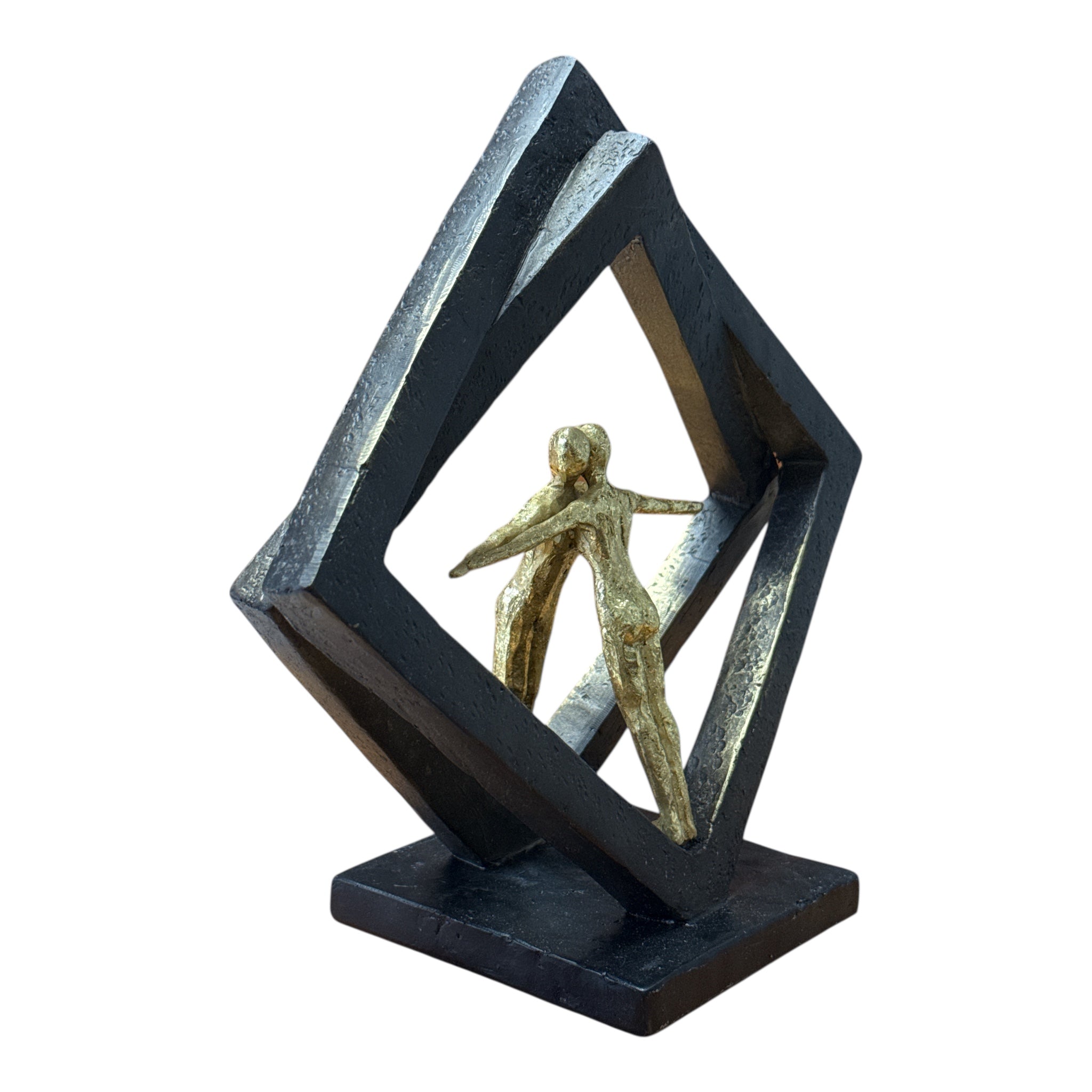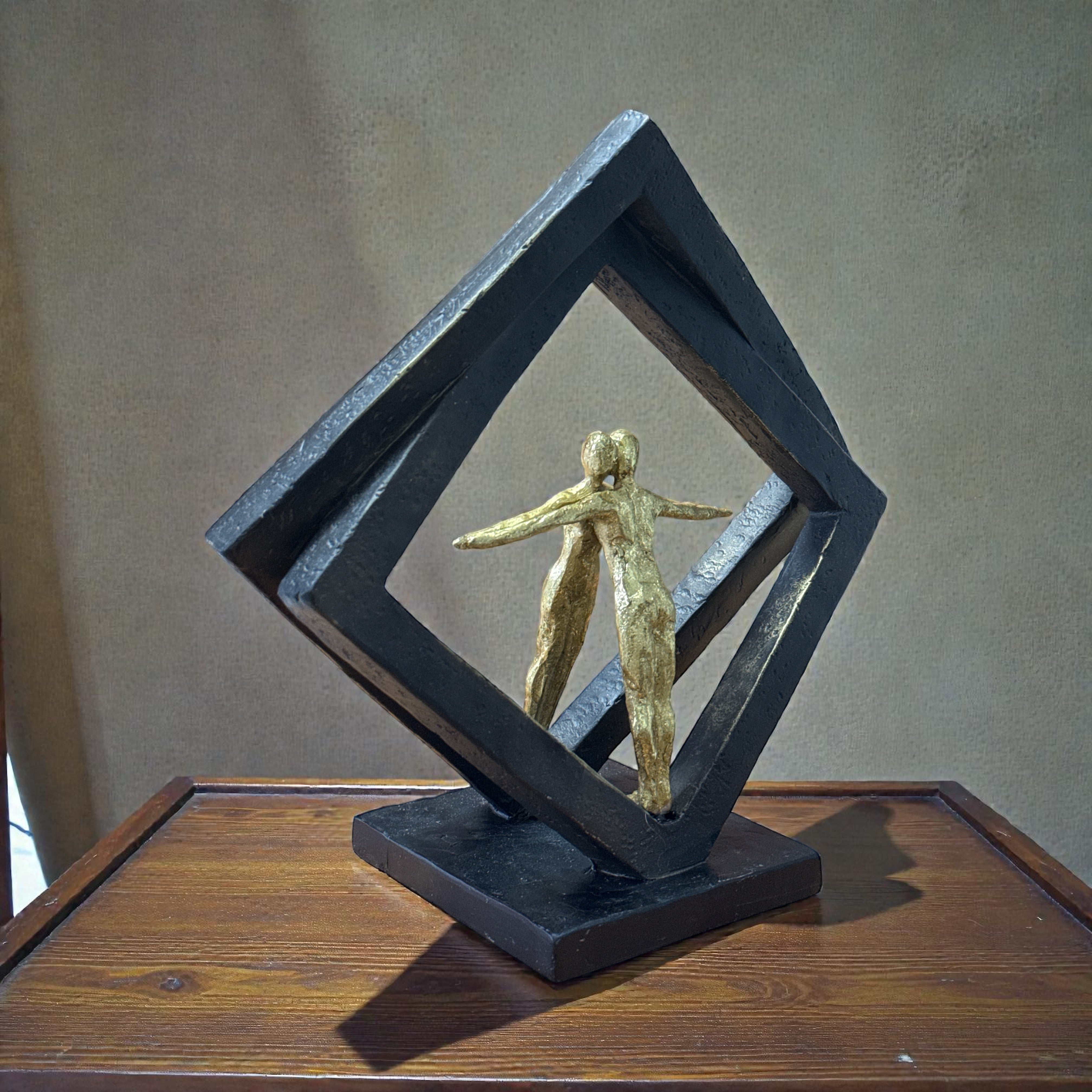O piesă decorativă cu impact vizual puternic, această sculptură modernă reprezintă un cuplu abstract, surprins într-o formă artistică ce simbolizează echilibrul, conexiunea și armonia. Rama geometrică creează un contrast sofisticat cu siluetele aurii, evidențiind designul contemporan și liniile curate