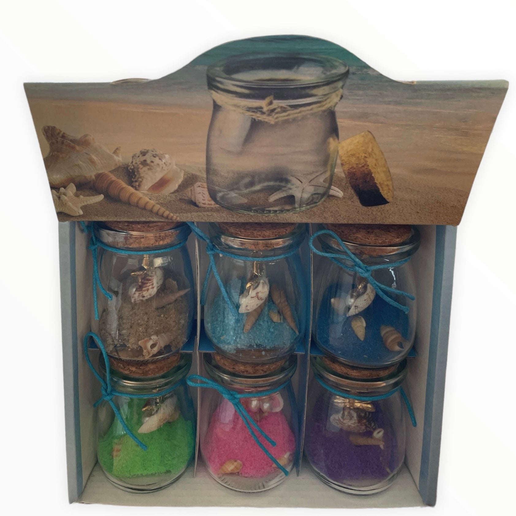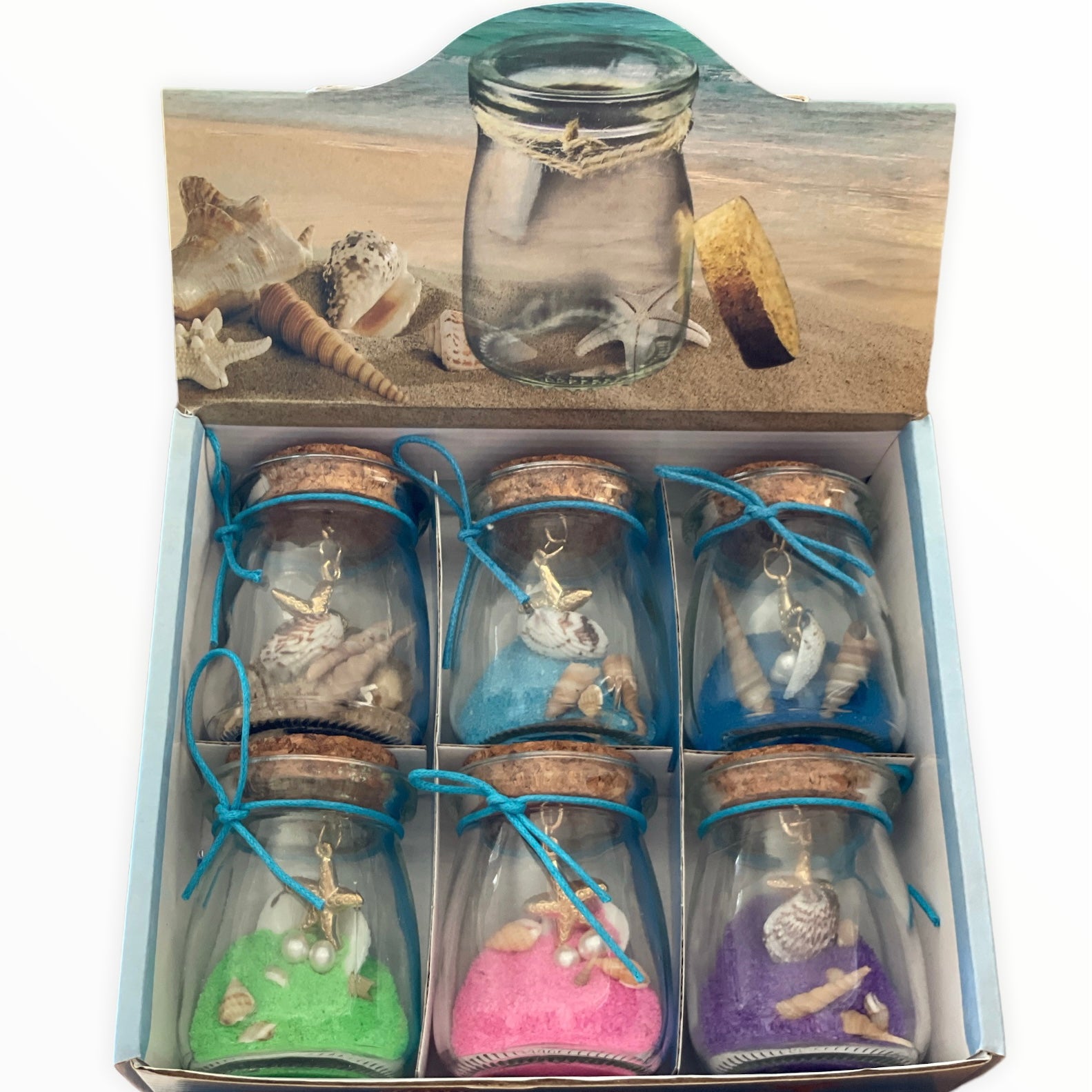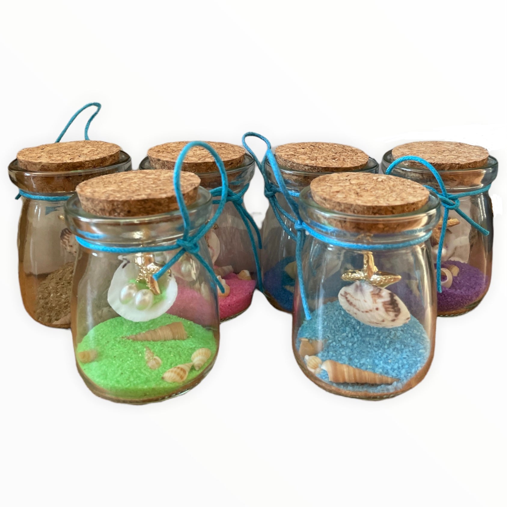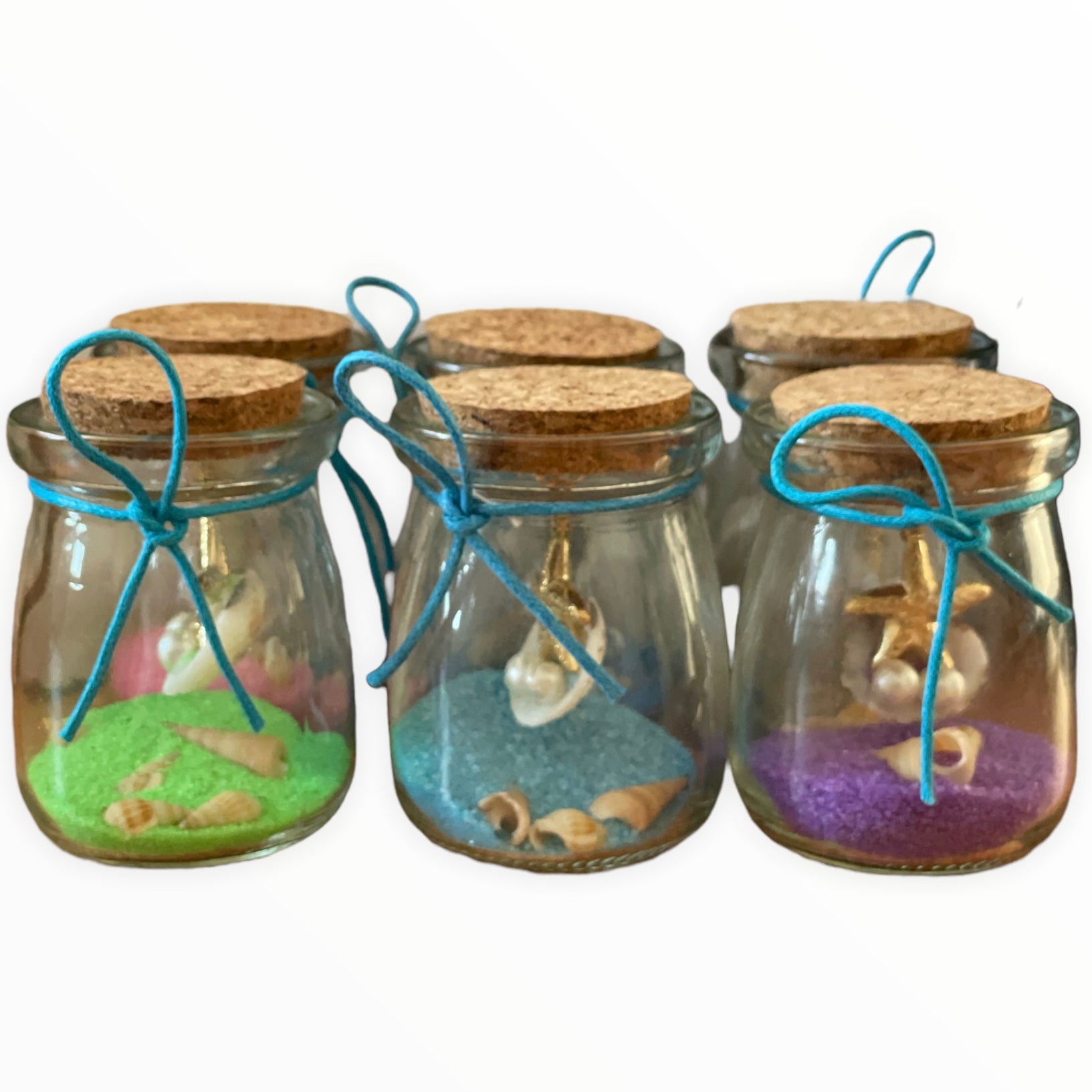 Sunt confecționate din sticlă transparentă și conțin nisip colorat și scoici naturale,toate sigilate cu un dop de plută.