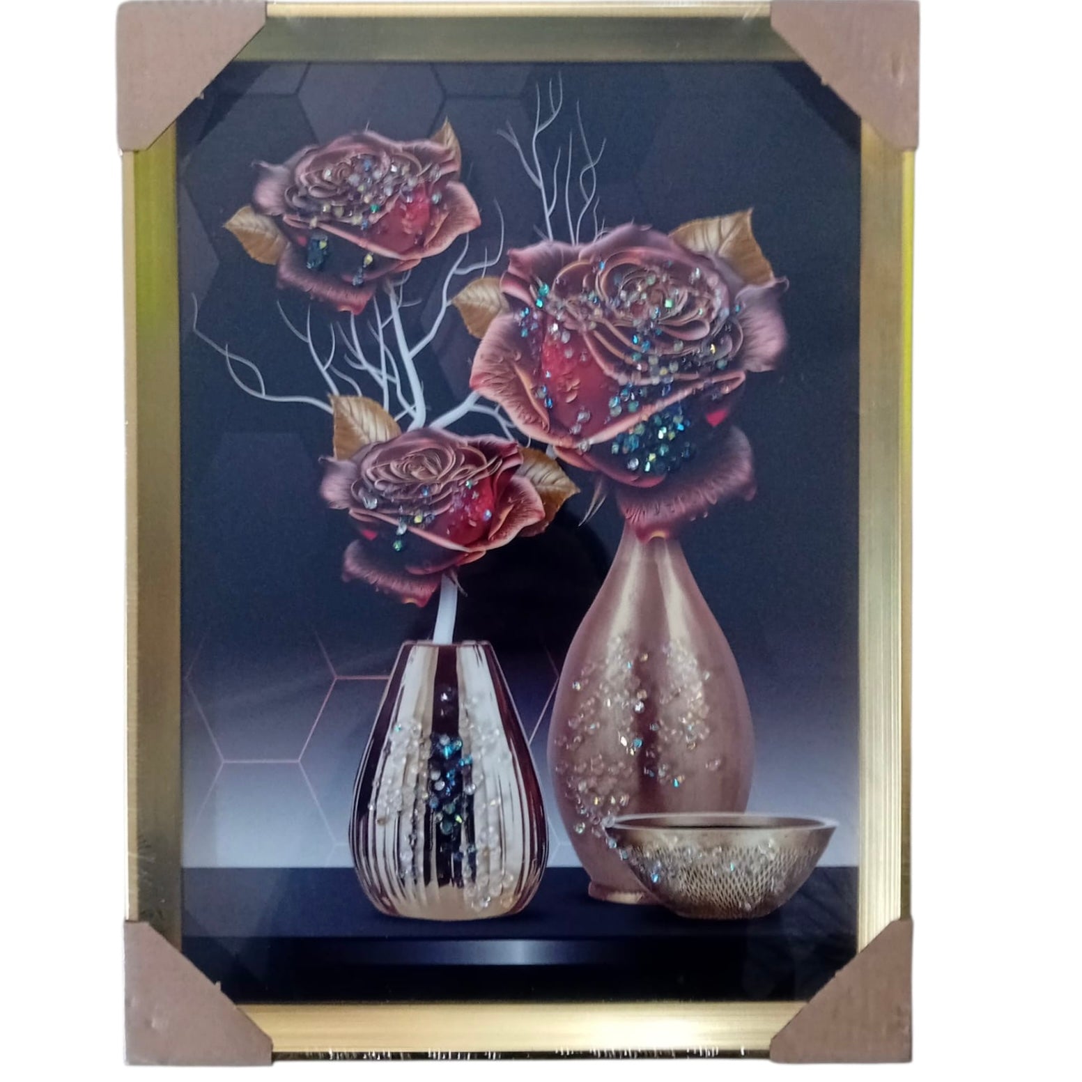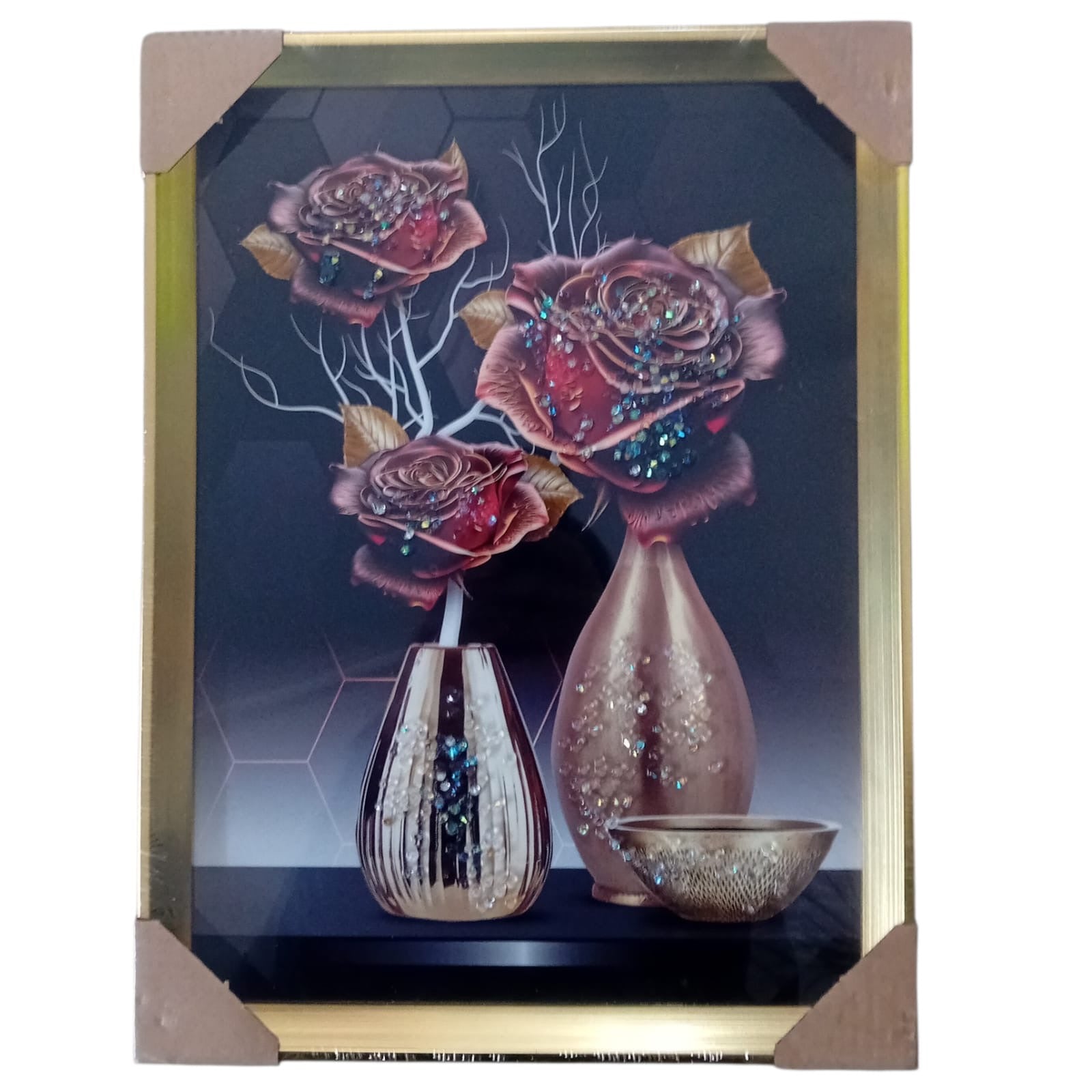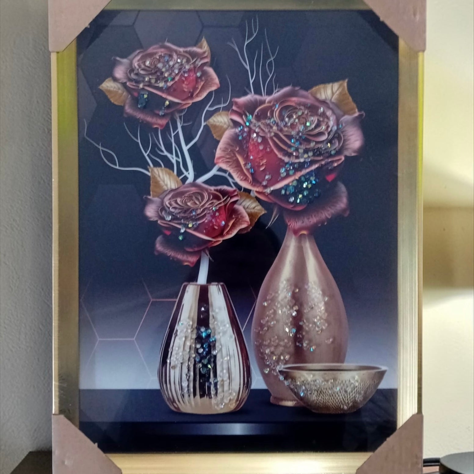 Tablou decorativ premium cu design floral sofisticat, reprezentând un aranjament elegant de trandafiri în nuanțe calde, completat de detalii strălucitoare cu efect 3D. Elementele decorative cu aspect de cristale reflectă lumina și creează un joc vizual rafinat, transformând tabloul într-un adevărat punct de atracție.