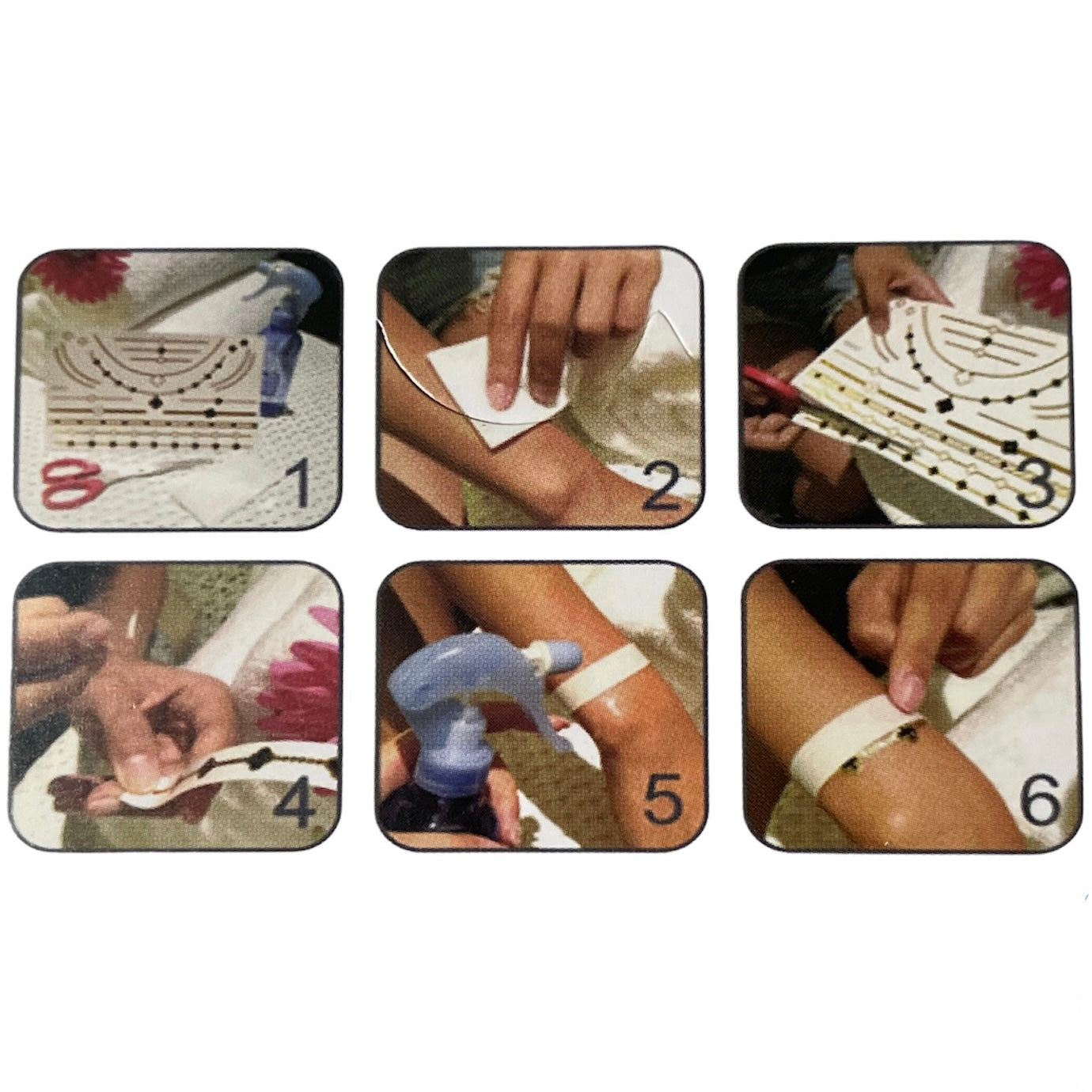 Mod de utilizare: Aplică pe încheietură sau pe partea anterioară a brațului pentru un efect splendid de brățară, pe gât pentru efectul de choker sau pe gleznă. Ori cere ajutorul unei prietene pentru a-ți crea design-uri unice pe spate. Se aplică pe pielea curată și se tamponează cu apă cu ajutorul unui burete moale.